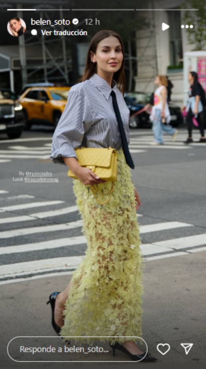 "Amando mi look", escribió Belén Soto en su cuenta, donde se la ve desfilar por las calles de Nueva York con una camisa de vestir a rayas y una maxifalda tipo lápiz con encaje, transparencias y flores de lentejuelas.