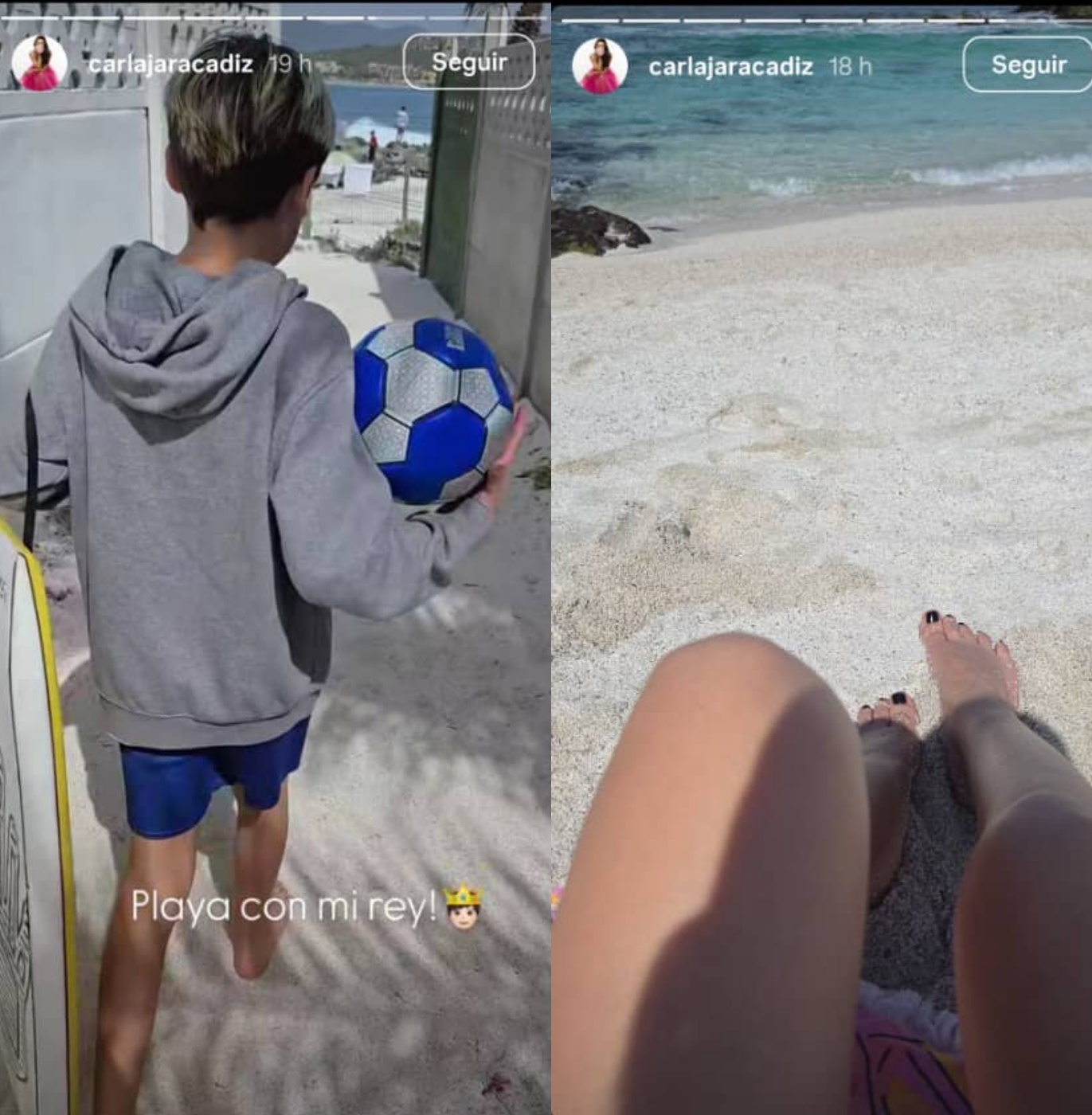 "Playa con mi rey", escribió Jara en una historia de Instagram, donde se ve a su niño caminar con emoción hacia la costa, con una pequeña tabla de surf y un balón en sus manos.