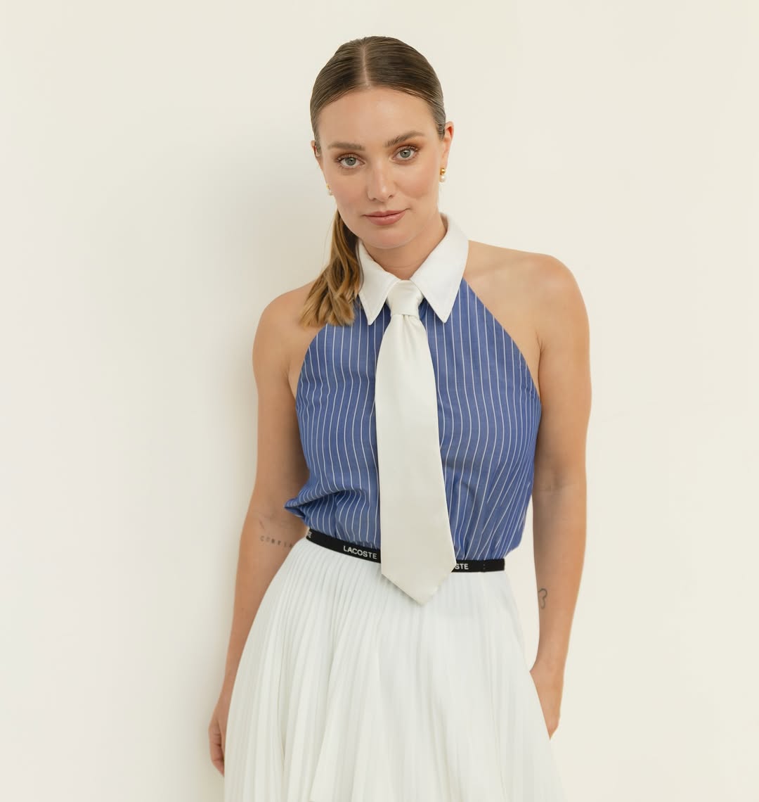 Para dar un toque de color, la comunicadora de 33 años optó por un top tipo halter en azul marino y con finas líneas verticales, al que añadió un cuello camisero blanco y una corbata a tono estilo preppy.