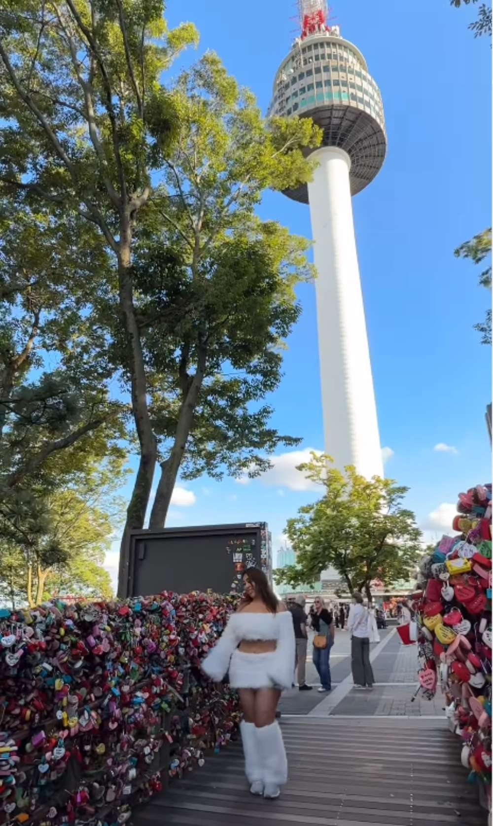 Momentos después, la empresaria publicó un recorrido que hizo por la capital, donde paseó por un puente lleno de candados del amor cerca de la N Seoul Tower, uno de los símbolos más reconocidos del país.