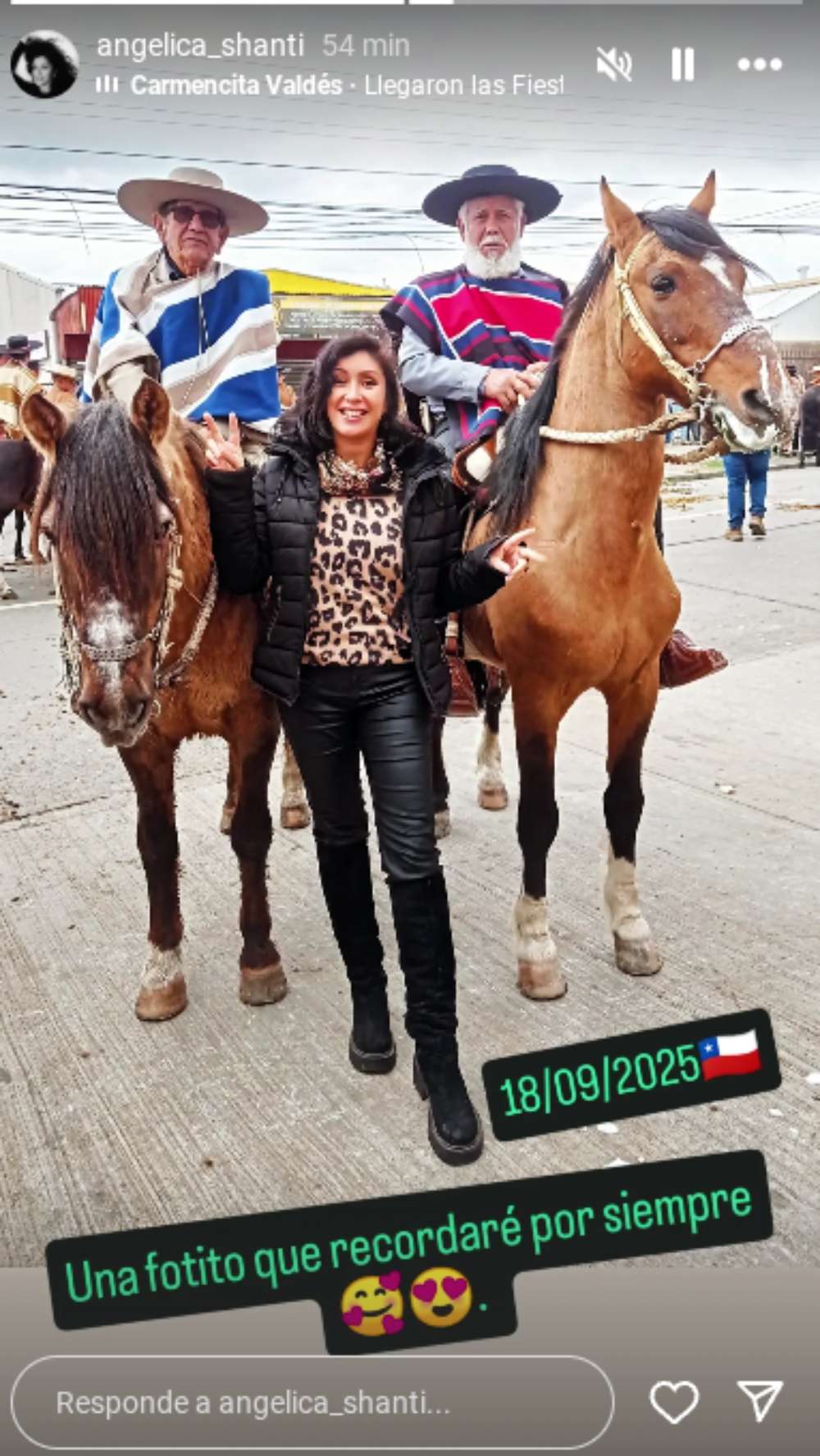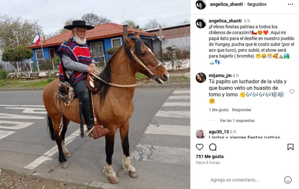 “¡Felices Fiestas Patrias a todos los chilenos de corazón! Aquí mi papá, listo para el desfile en nuestro pueblo de Yungay. Le costó subir por el ACV que tuvo, pero subió. El show será para bajarlo”, bromeó Angélica en un post que hizo luego en la red social.