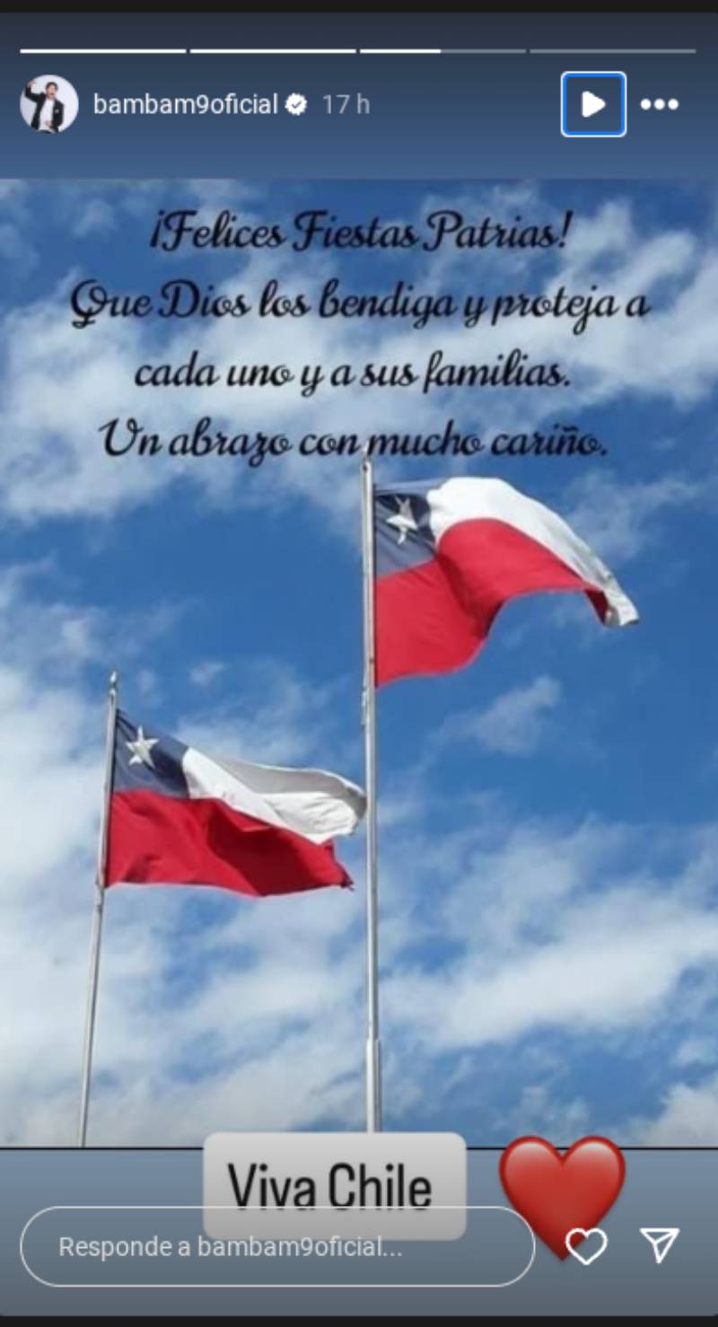 "¡Felices Fiestas Patrias! Que Dios los bendiga y proteja a cada uno y a sus familias. Un abrazo con mucho cariño", indica la postal, a la cual agregó un emoji de corazón y la frase "viva Chile".