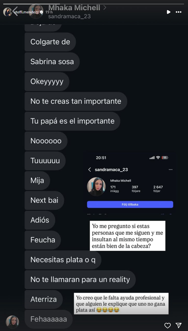 Por supuesto que Steffi Méndez no se quedó en silencio y respondió: "Yo me pregunto si estas personas que me siguen y me insultan al mismo tiempo, ¿están bien de la cabeza?".