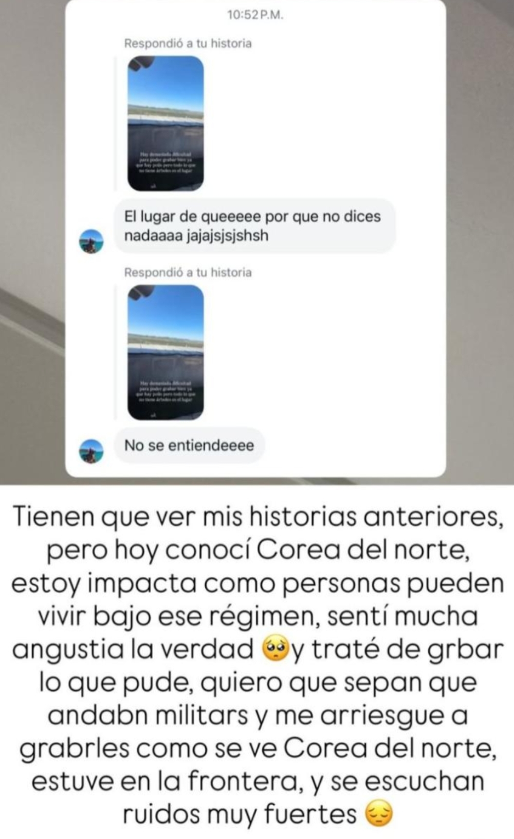 “Quiero que sepan que andan militares y me arriesgué a grabarles cómo se ve Corea del Norte, estuve en la frontera y se escuchan ruidos muy fuertes”, añadió, reconociendo que capturó imágenes pese a las restricciones del lugar.