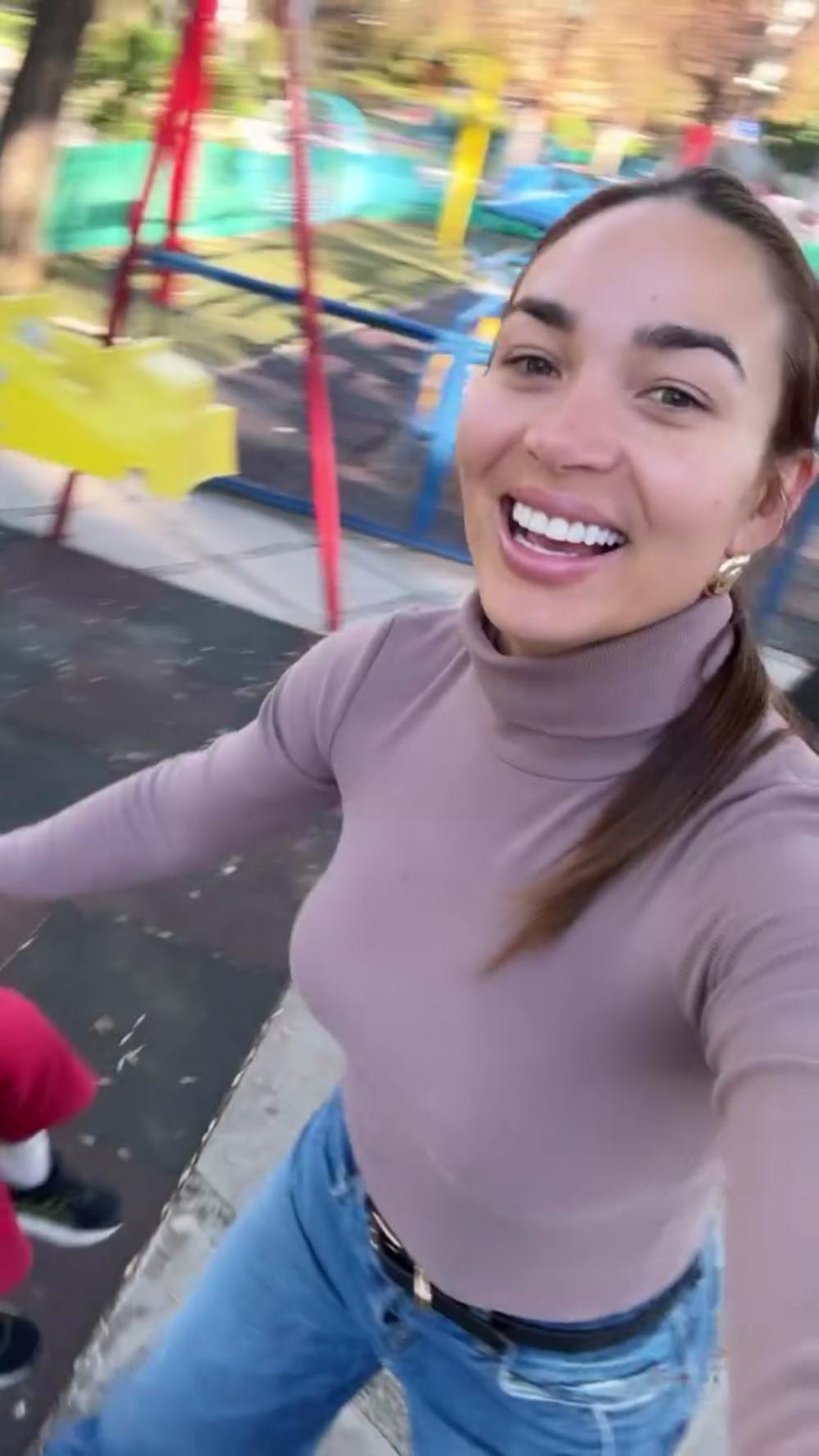 “Estoy acá columpiando a mis hijos y el Noah me dice que quiere ser gimnasta cuando crezca. Entonces yo le dije que de pequeña yo también era gimnasta”, relató en Instagram la influencer, de 38 años.