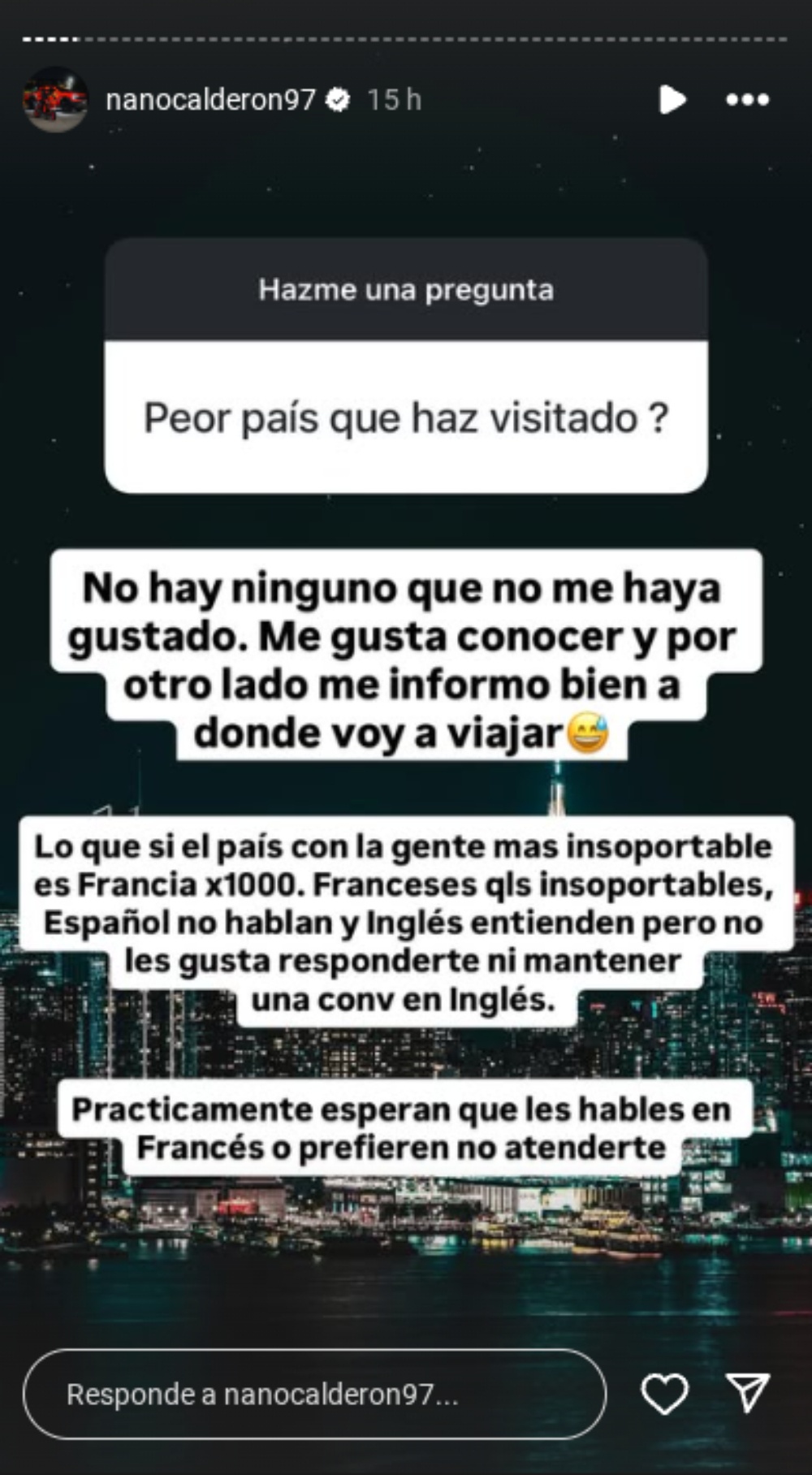 Sin embargo, fue tajante al señalar un destino en particular: “El país con la gente más insoportable es Francia. Los franceses son insoportables, español no hablan y en inglés entienden, pero no les gusta responderte ni mantener una conversación”.