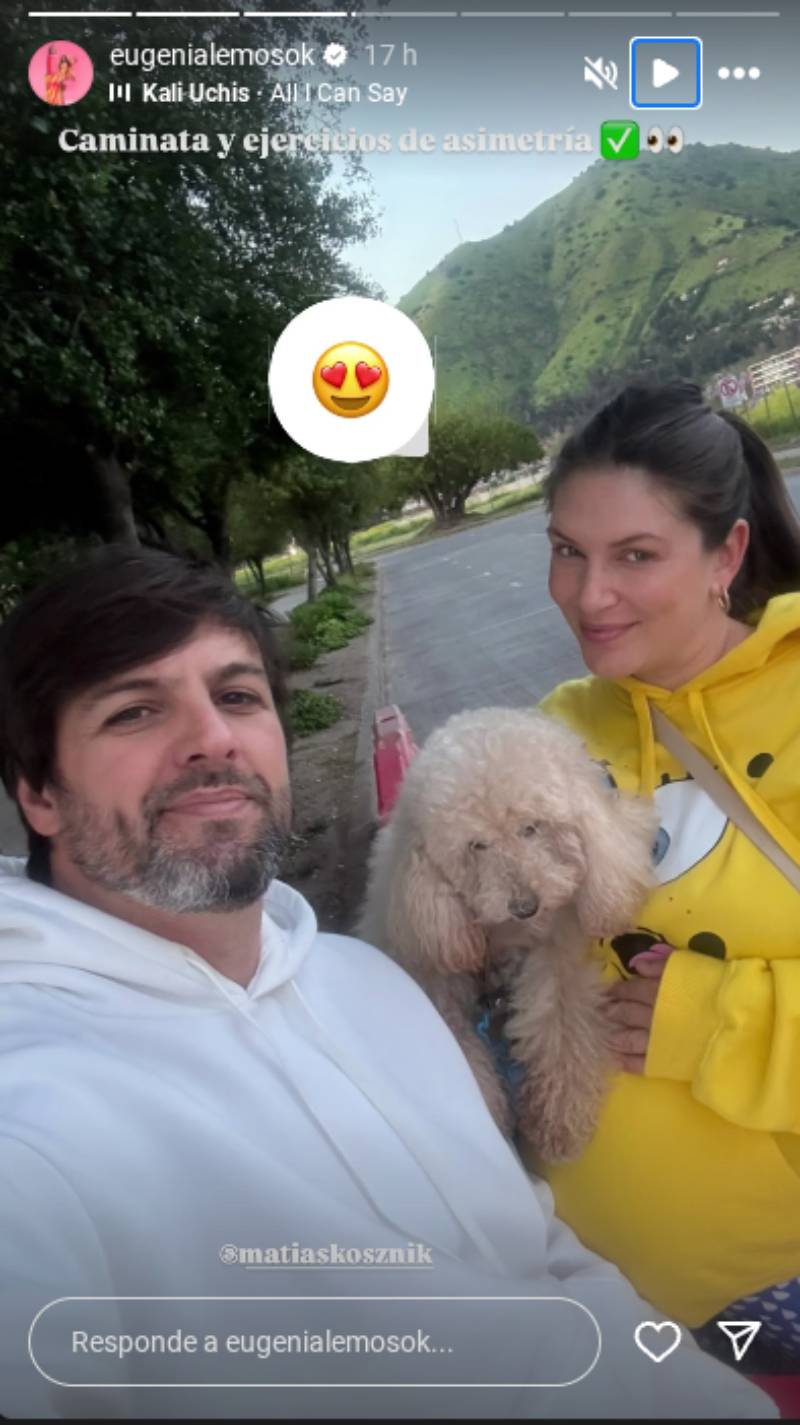 "Caminata y ejercicios de asimetría", escribió Eugenia Lemos en una de sus historias de Instagram, donde subió una selfie junto a Matías y su inseparable perrito León, en lo que parece ser un parque.