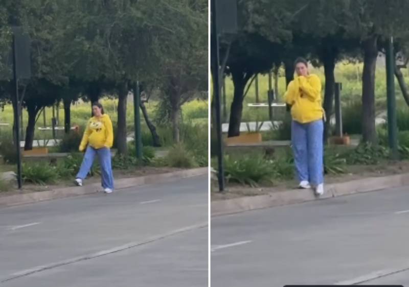 Vestida con un pantalón holgado en tono azul y un polerón amarillo de Bob Esponja, la argentina enseñó que este ejercicio consiste en caminar al borde de la acera, subiendo uno de sus pies en el desnivel.