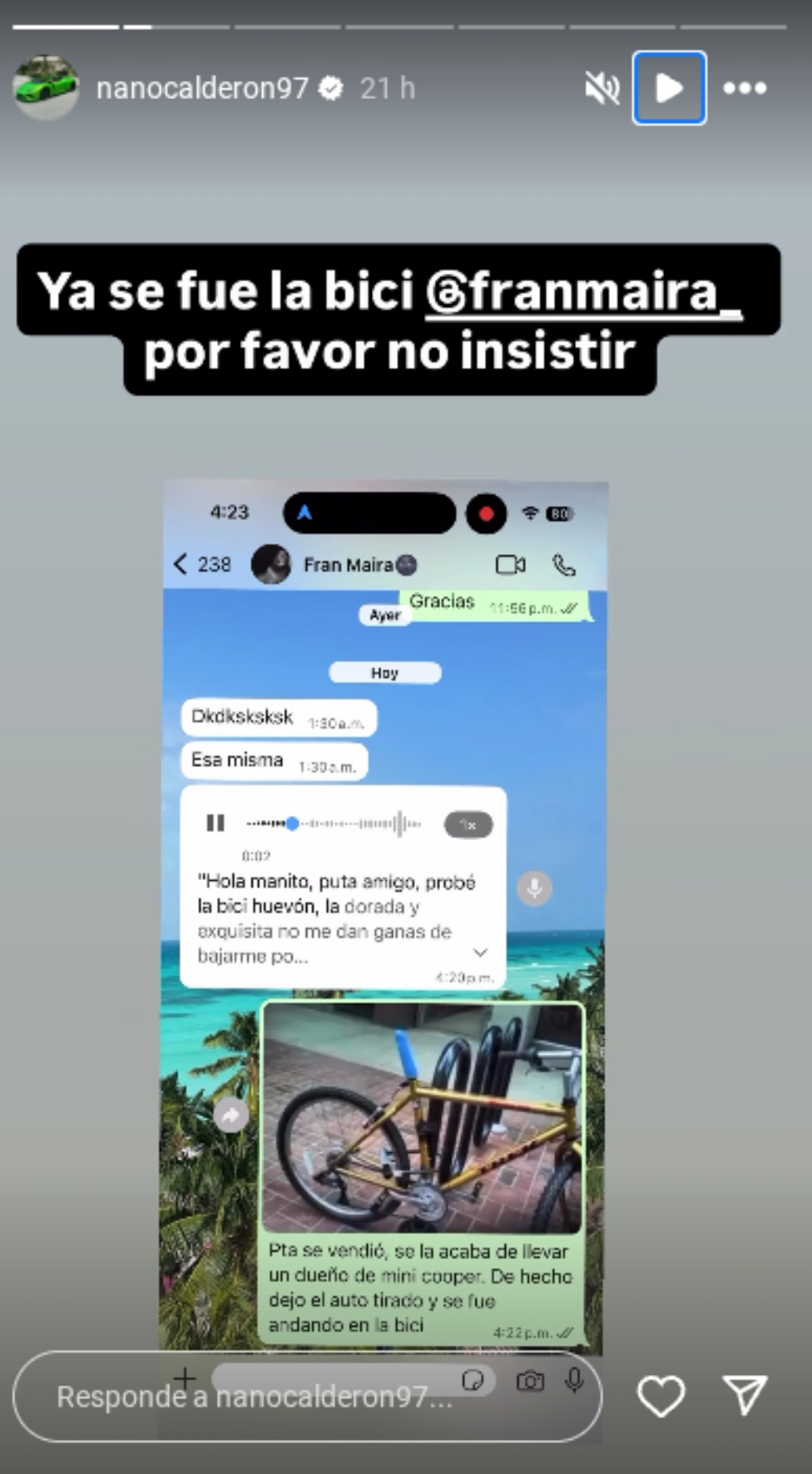 Finalmente, cerró la historia con un mensaje directo hacia ella: “Ya se fue la bici, Fran, por favor no insistir”. Entre bromas, pantallazos y un asiento insólito, la bicicleta terminó convirtiéndose en un episodio que mezcló humor, ironía y un final inesperado.