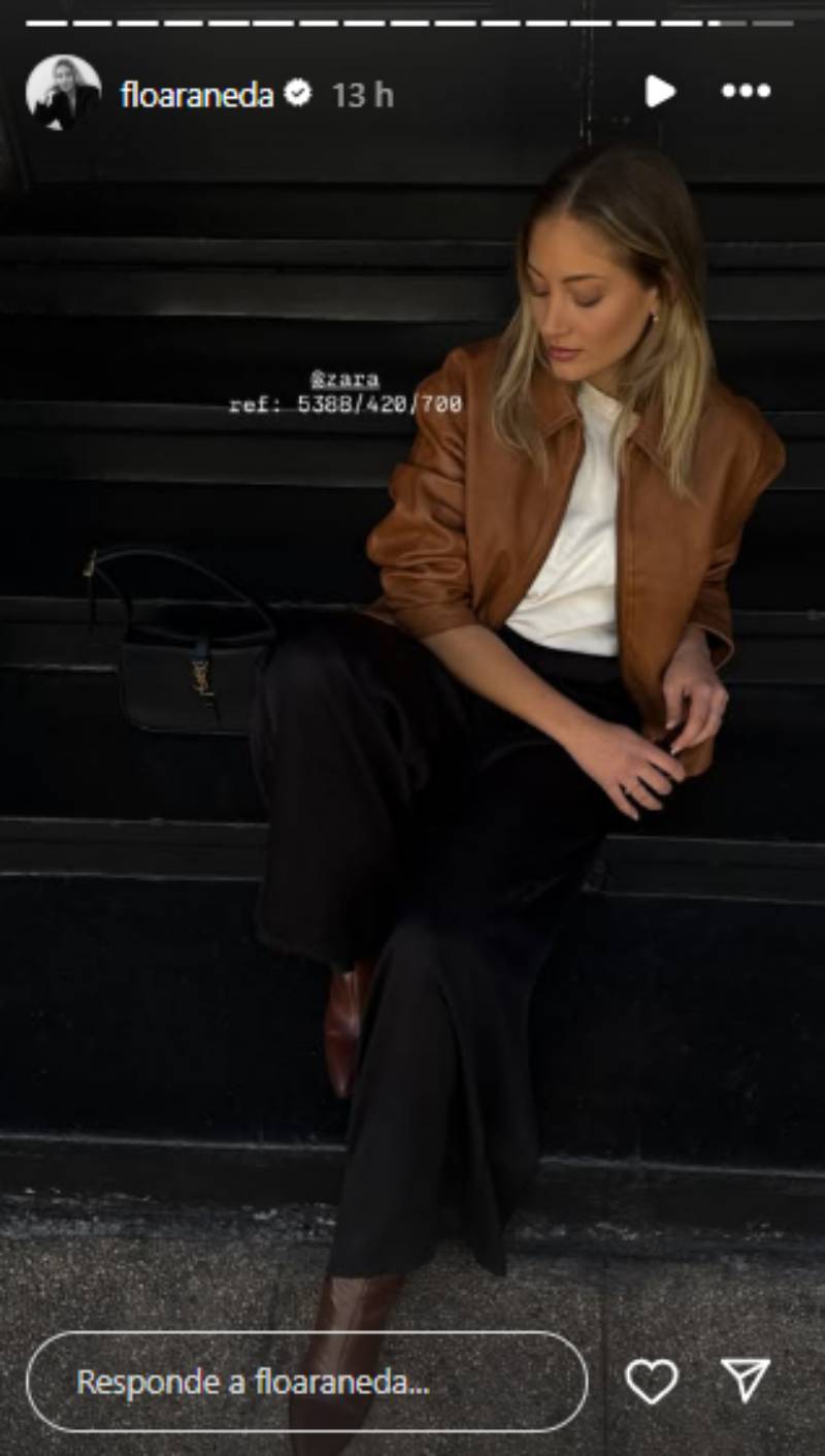 En las fotos que publicó, Florencia viste una polera blanca de cuello cerrado con un pantalón negro de silueta fluida. Esta combinación sirvió de base para resaltar con fuerza su chaqueta de cuero marrón.
