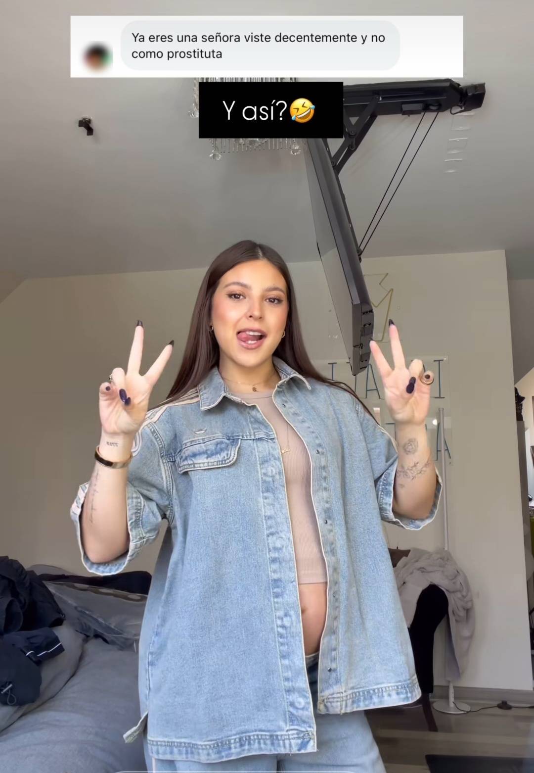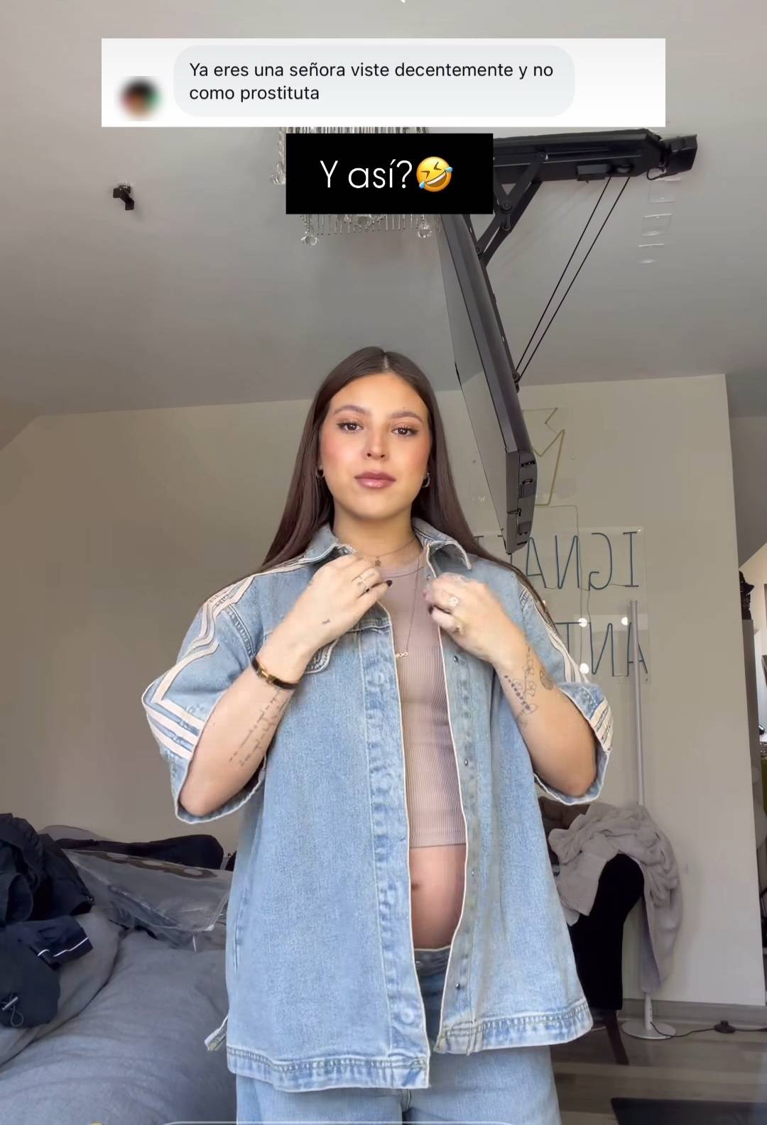“Ya eres una señora, viste decentemente y no como prostituta”, fue el grosero mensaje al que la joven de 24 respondió mostrándole un moderno outfit en denim con el que dejó ver su vientre abultado.