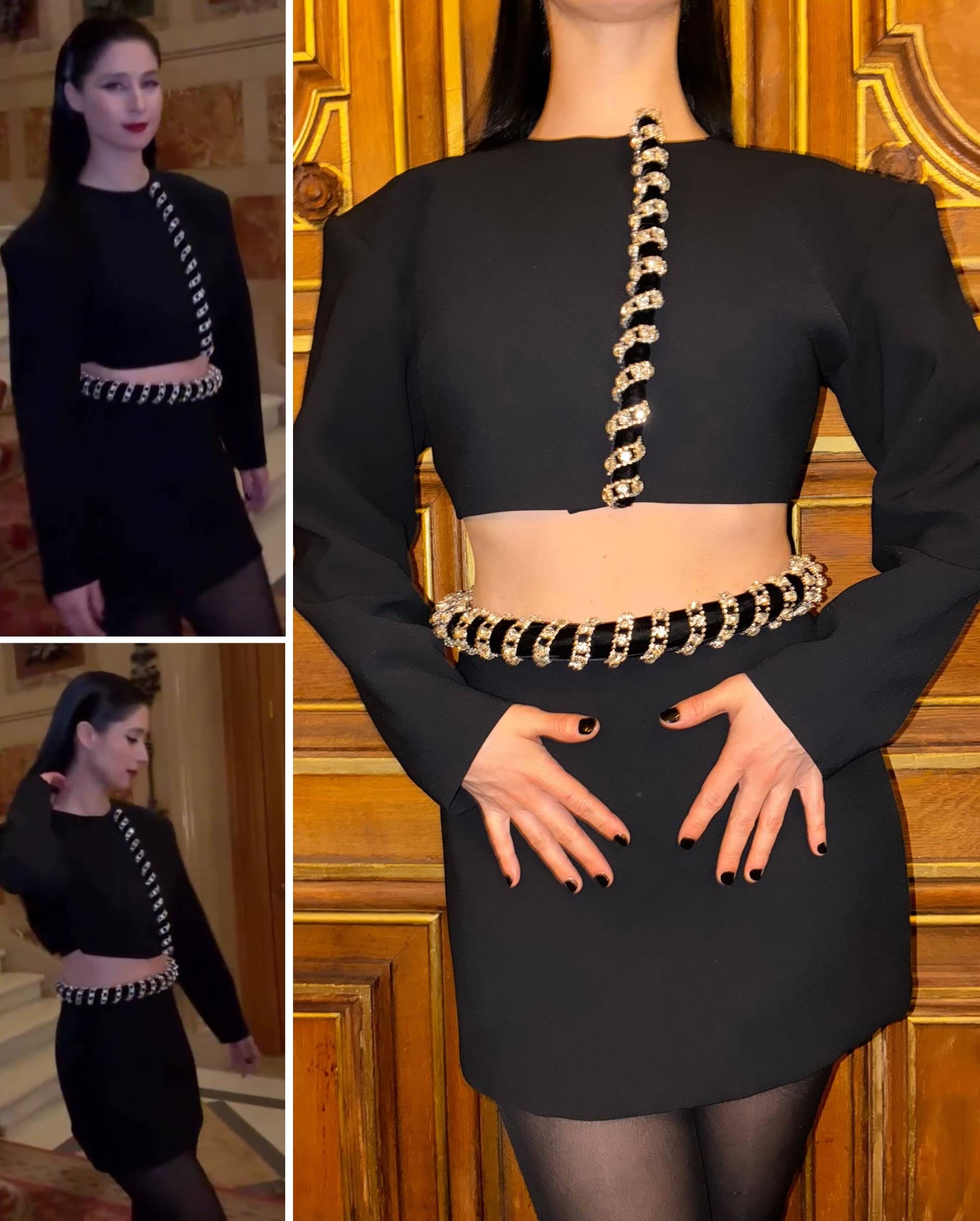 Tras ensayar en la tarde del desfile, Fran se ajustó su vestuario y salió radiante con un traje negro de dos piezas de Raisa Vanessa, un maquillaje destacado por labios rojos y su cabello peinado hacia atrás en un estilo mojado, obra de su estilista Niki Ossandón.