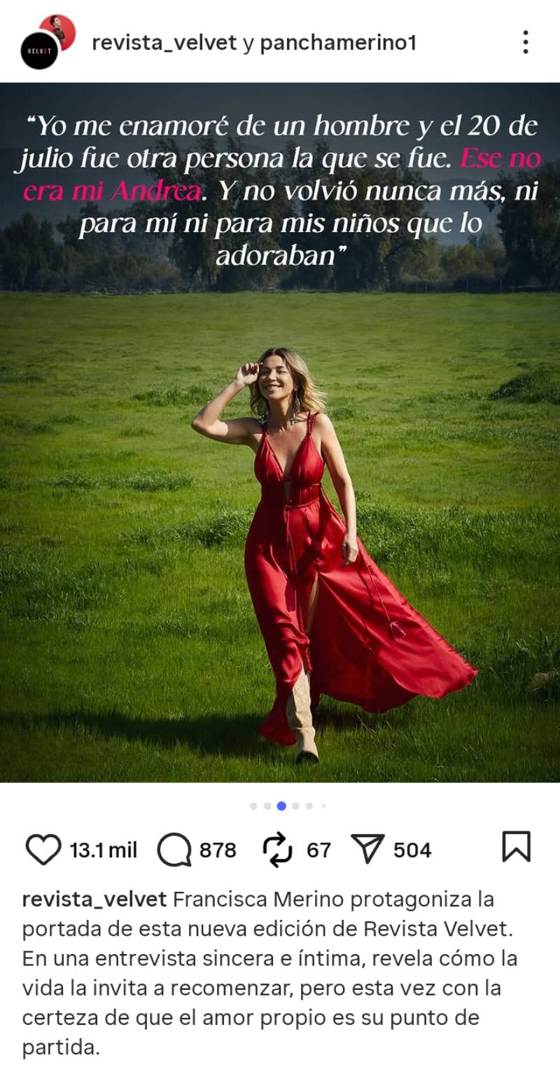 “Cuando no te aman, debes soltar”, es el título bajo el que los editores de Velvet presentan la conversación con Pancha Merino. La artista de 52 años compartió una publicación en la que resume parte de sus palabras y comienza diciendo la fecha exacta en la que Marocchino abandonó el hogar, un hombre al que ya no reconocía.
