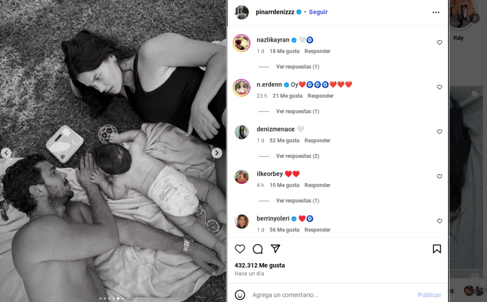 En la publicación que hizo en Instagram, la actriz turca aparece acostada junto a su bebé y su esposo al aire libre en una estampa natural y en blanco y negro.
