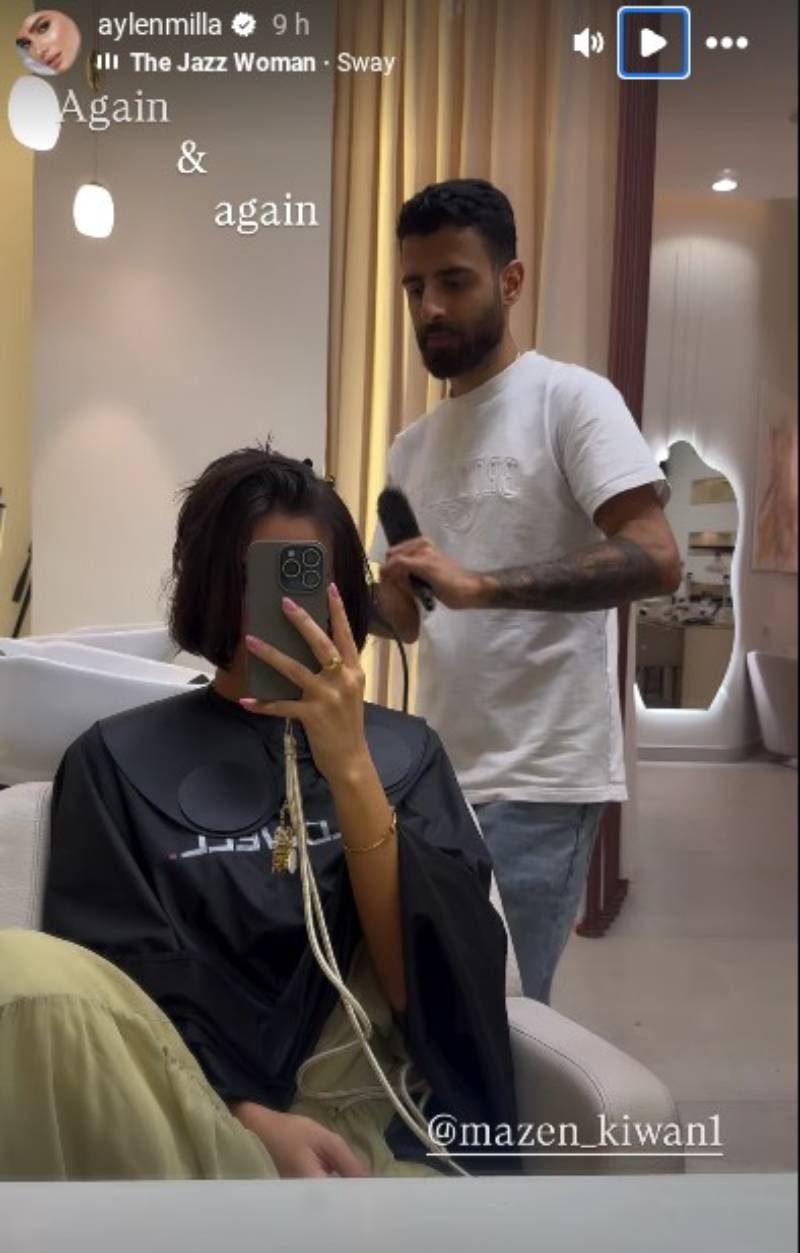 “Again & Again”, escribió sobre el video en el que se observa sentada en la peluquería y en manos de su estilista Mazen Kiwan, ratificando su estilo bob para un look que sin duda alguna realza sus rasgos faciales.
