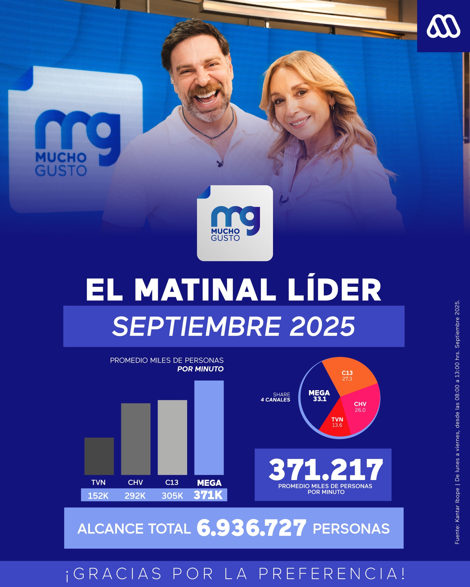 De esta manera se consolidó como la primera preferencia de los hogares chilenos para acompañarse e informarse durante la primera mitad del día. Asimismo, Mucho Gusto tuvo un alcance total de 6.936.727 de personas durante el reciente mes de septiembre.