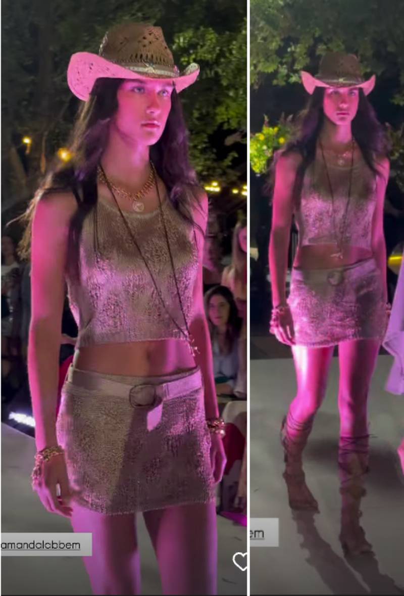 A sus 17 años, Amanda brilló sobre la pasarela con un look estilo vaquero de la diseñadora Ropero Paula: un conjunto de top sin mangas y minifalda plateada, combinado con un sombrero de paja y sandalias romanas.
