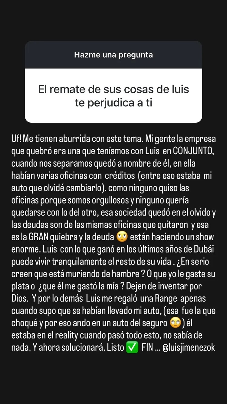 "Uf! Me tienen aburrida con este tema. Mi gente, la empresa que quebró era una que teníamos con Luis en conjunto. Cuando nos separamos, quedó a nombre de él. En ella había varias oficinas con créditos (entre eso estaba mi auto que olvidé cambiarlo)", explicó.