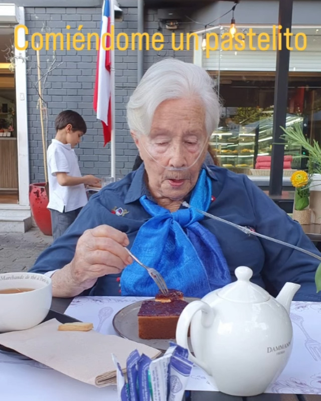 En el registro se puede apreciar cómo Guzmán utiliza una cánula nasal, acompañando la imagen con la frase: "Comiéndome un pastelito".