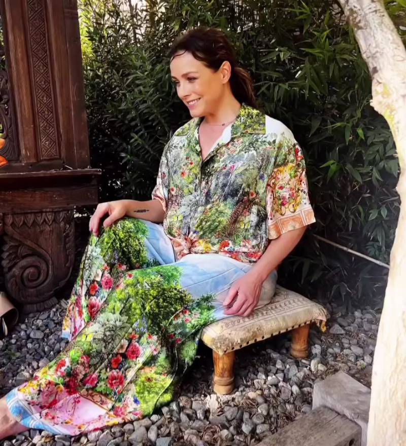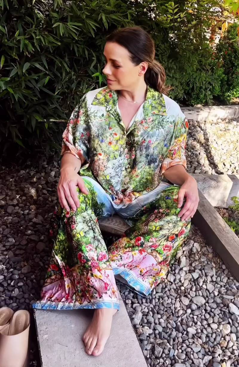Allí posó sentada en un rincón de su patio, vestida con un conjunto holgado de camisa de seda y pantalones rectos a juego, ambos con un romántico estampado de flores.