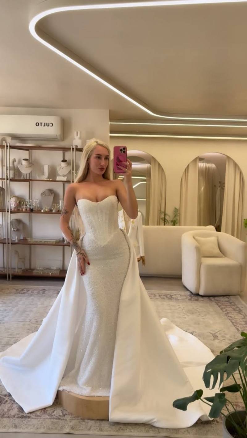Segundos después, el plano de cámara se abrió y se vio con un vestido largo blanco, de escote strapless en forma de corazón bordado en su totalidad en lentejuelas. El corpiño estilo corsé dibujó su silueta, mientras se apreciaba la falda en corte de sirena, junto a una gran cola.