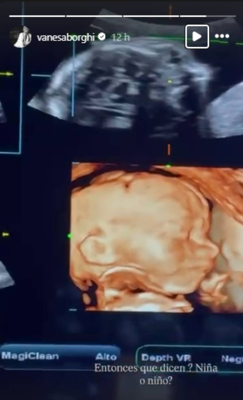 En sus historias de Instagram, Vanesa subió un tierno video del ecograma de su bebé, a quien se le ve con gran nitidez el rostro. Allí, Borghi escribió la frase: “Entonces, ¿qué dicen? ¿Niña o niño?”.