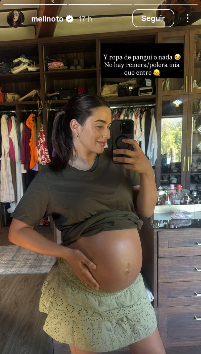 Anteriormente Meli había subido a sus historias de Instagram una foto frente a un espejo de su casa. En la imagen, ella luce una polera holgada verde militar de Pangal y una falda con bordados en un tono verde menta.