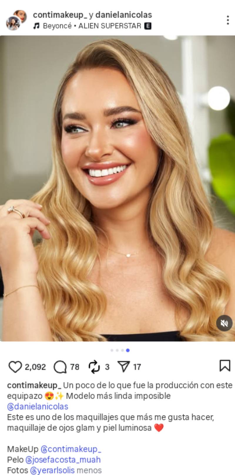 “Modelo más linda imposible”, destacó Correa en su perfil, donde también compartió algunas fotos del estilismo final de Daniela Nicolás. “Este es uno de los maquillajes que más me gusta hacer, maquillaje de ojos glam y piel luminosa”, agregó.