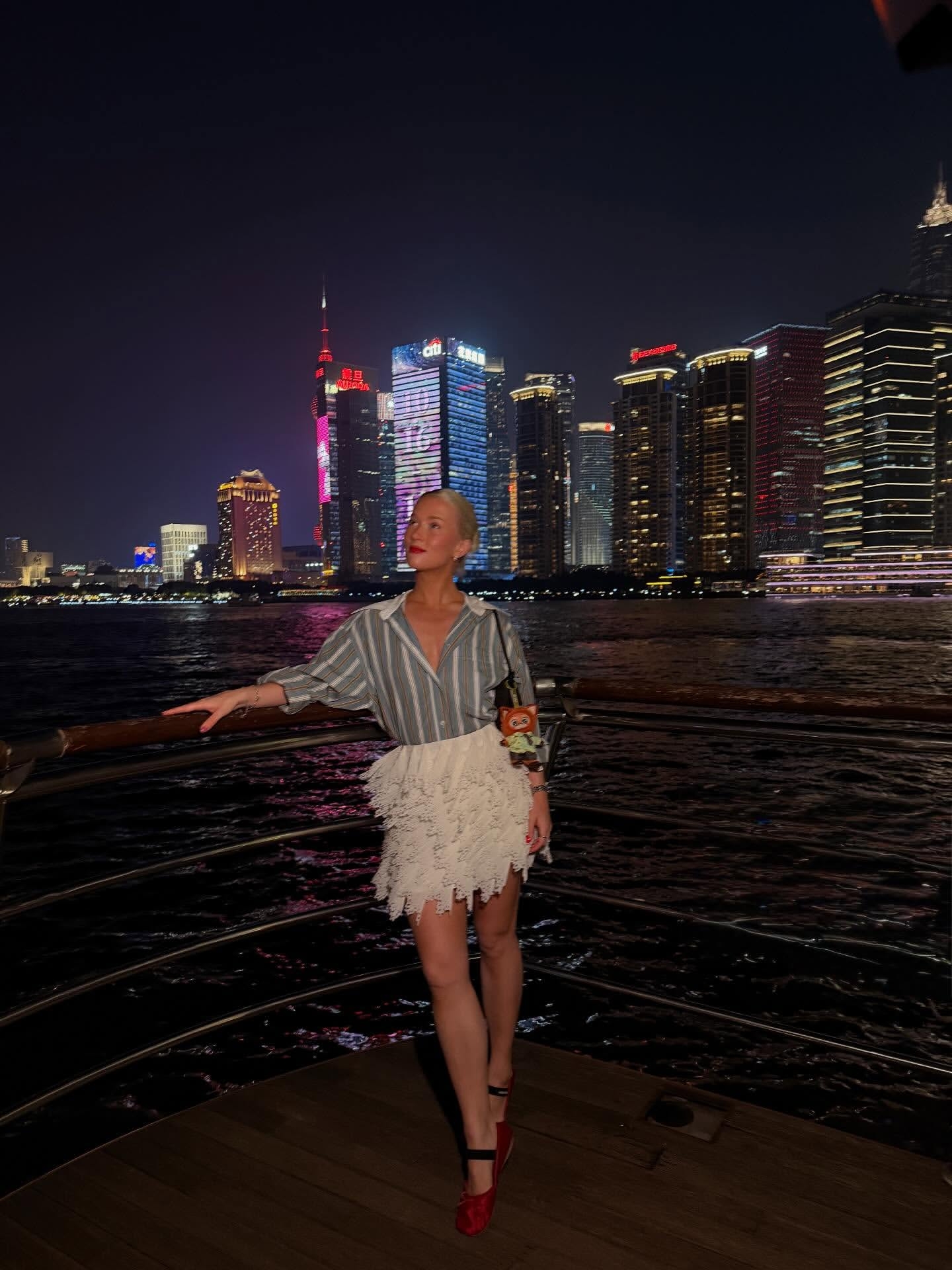 En sus postales, la cantante posó frente a la vibrante Shanghái nocturna con una camisa de botones a rayas blancas, azules y marrones, junto a una moderna minifalda con olanes texturizados.