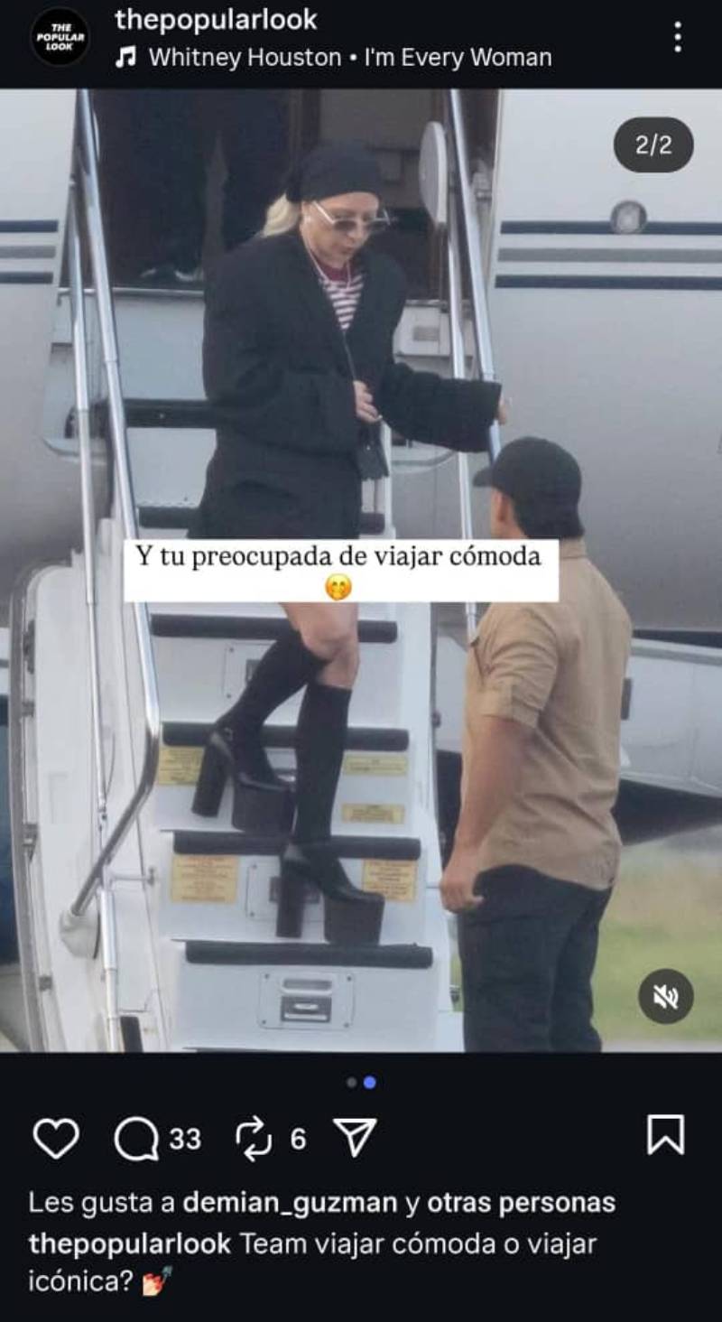 En su publicación, el perfil especializado en moda compartió las fotos en las que se ve a la intérprete de "Poker face" bajar del avión privado, con unas ceñidas botas de plataforma extragrande. Las imágenes abrieron todo un debate en los comentarios.