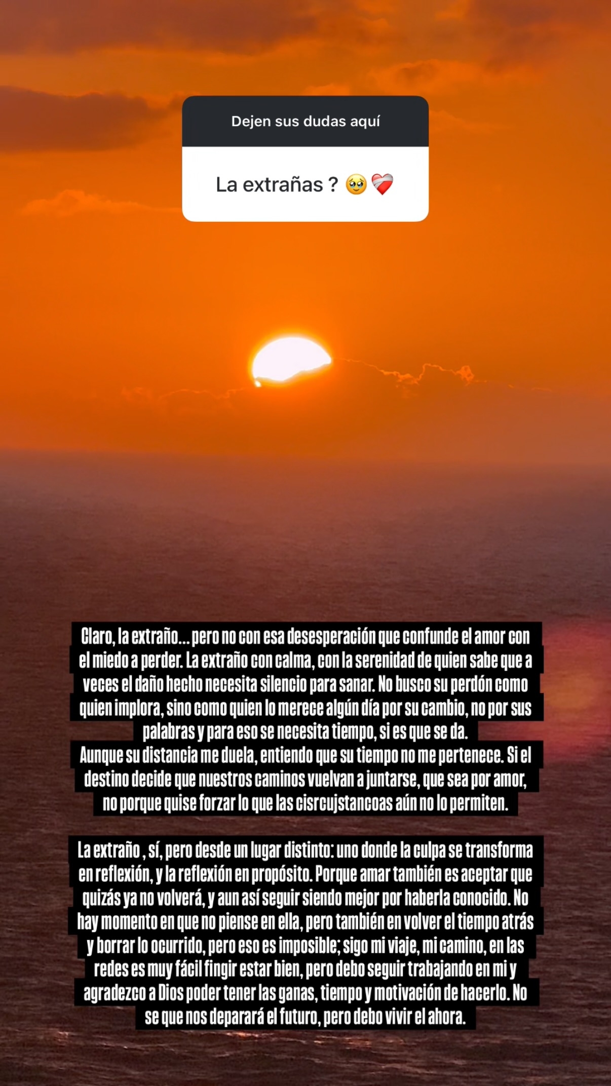 "Claro, la extraño... pero no con esa desesperación que confunde el amor con el miedo a perder. La extraño con calma, con la serenidad de quien sabe que a veces el daño hecho necesita silencio para sanar. No busco su perdón como quien implora, sino como quien lo merece algún día por su cambio, no por sus palabras y para eso se necesita tiempo, si es que se da", confesó.