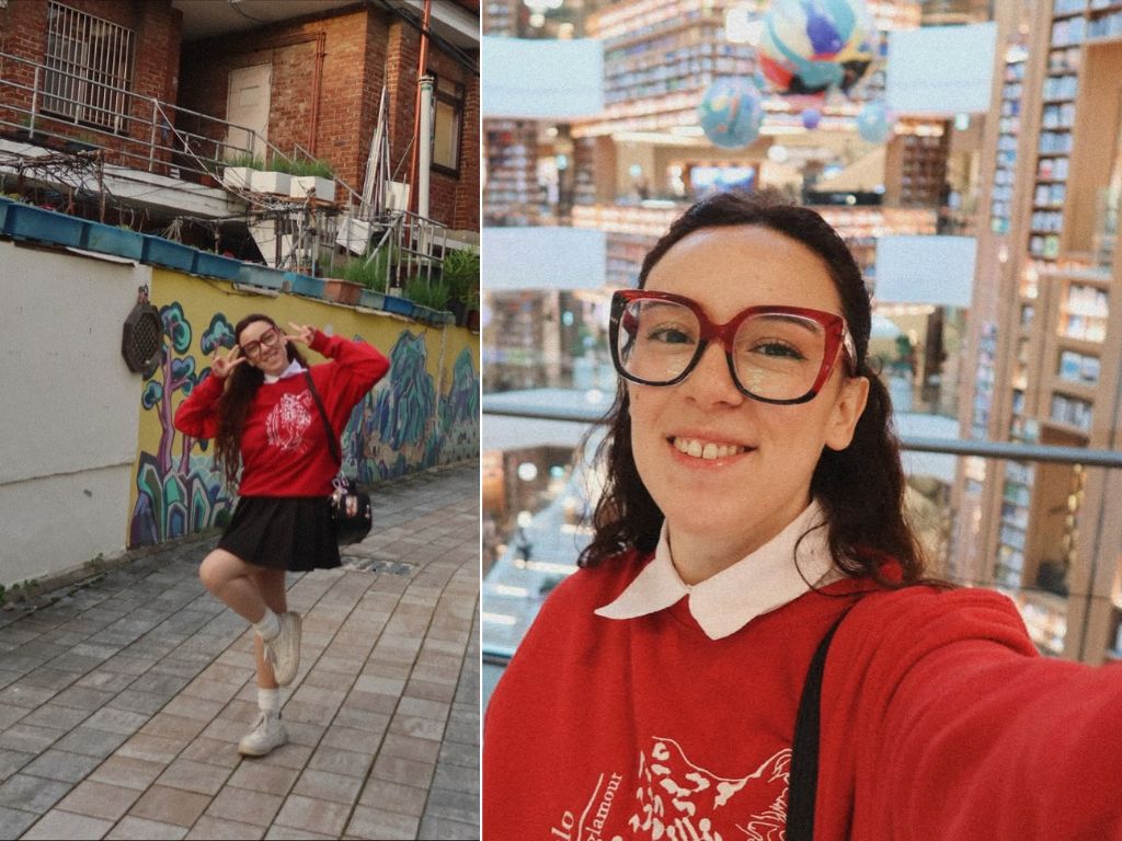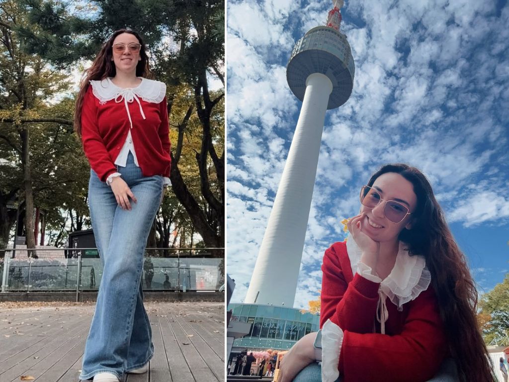 El rojo es el color estrella de Christell para pasear por Corea del Sur: Así combinó un cárdigan y polerón