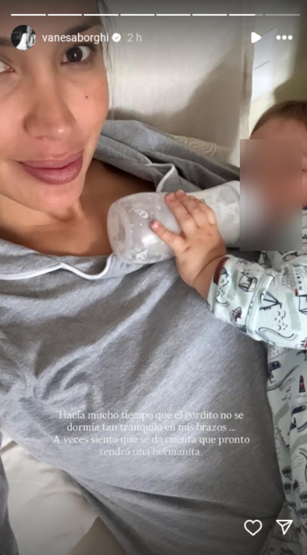 “Hace ya mucho tiempo que el gordito no se dormía tan tranquilo en mis brazos. A veces siento que se da cuenta que pronto tendrá una hermanita”, escribió Borghi sobre una enternecedora postal que publicó en Instagram.