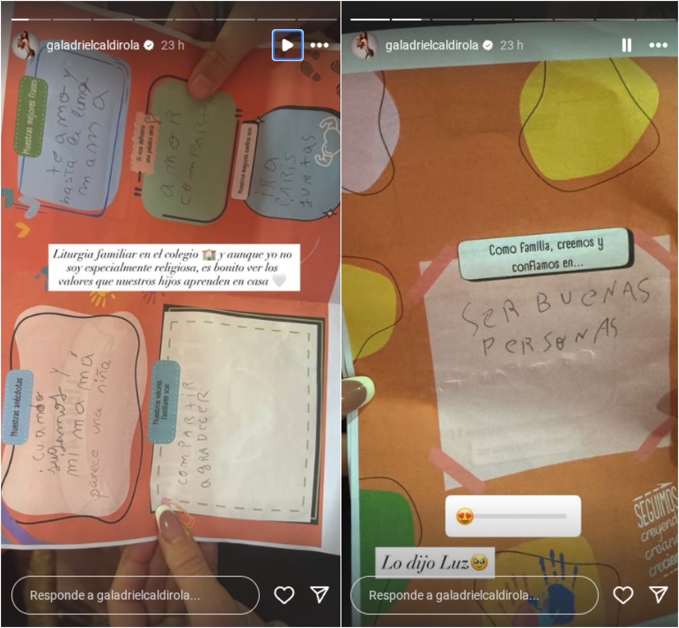 "Como familia, creemos y confiamos... En ser buenas personas", escribió la niña. Conmovida, Gala Caldirola expresó: "Me pareció hermoso poder escuchar de mi hija cuáles son los valores que aprendió en casa y que para ella, como familia, creemos y confiamos en 'Ser buenas personas'".