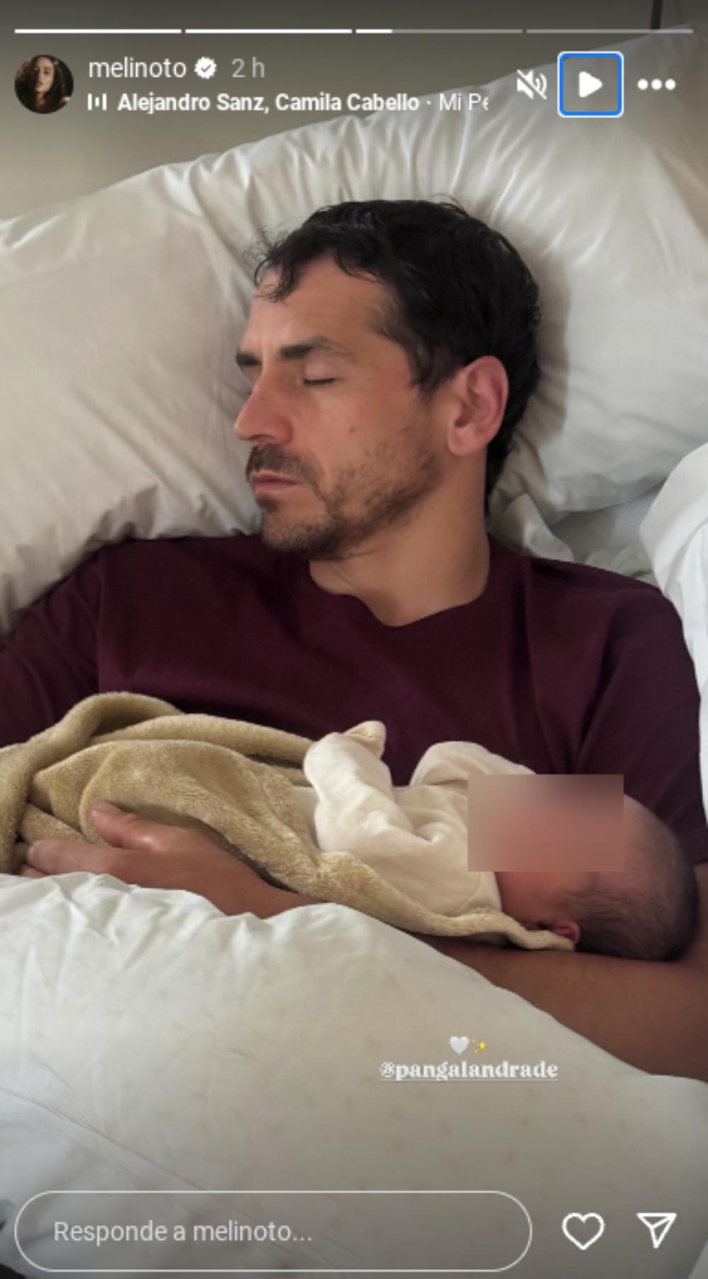 En sus historias de Instagram, la animadora publicó una imagen en la que aparece Pangal sumido en un sueño profundo, al igual que la pequeña que yace rendida en sus brazos.