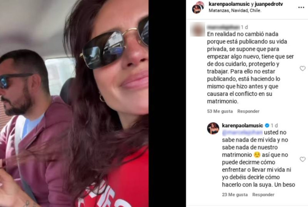 Unos momentos después, la cantante compartió una tajante respuesta. “Usted no sabe nada de mi vida y no sabe nada de nuestro matrimonio, así que no puede decirme cómo enfrentar o llevar mi vida. Ni yo debo decirle cómo hacerlo con la suya. Un beso”, contestó Karen, dando por cerrada la conversación.