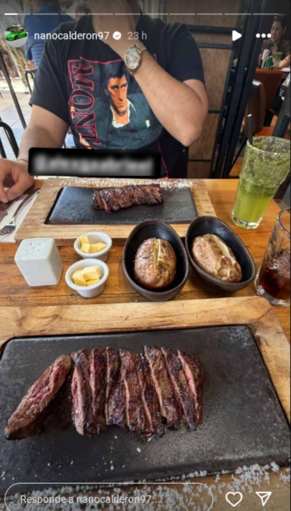 En sus historias de Instagram, el influencer publicó una foto de los platos que disfrutó en el restaurante, un jugoso corte de carne con papas horneadas.