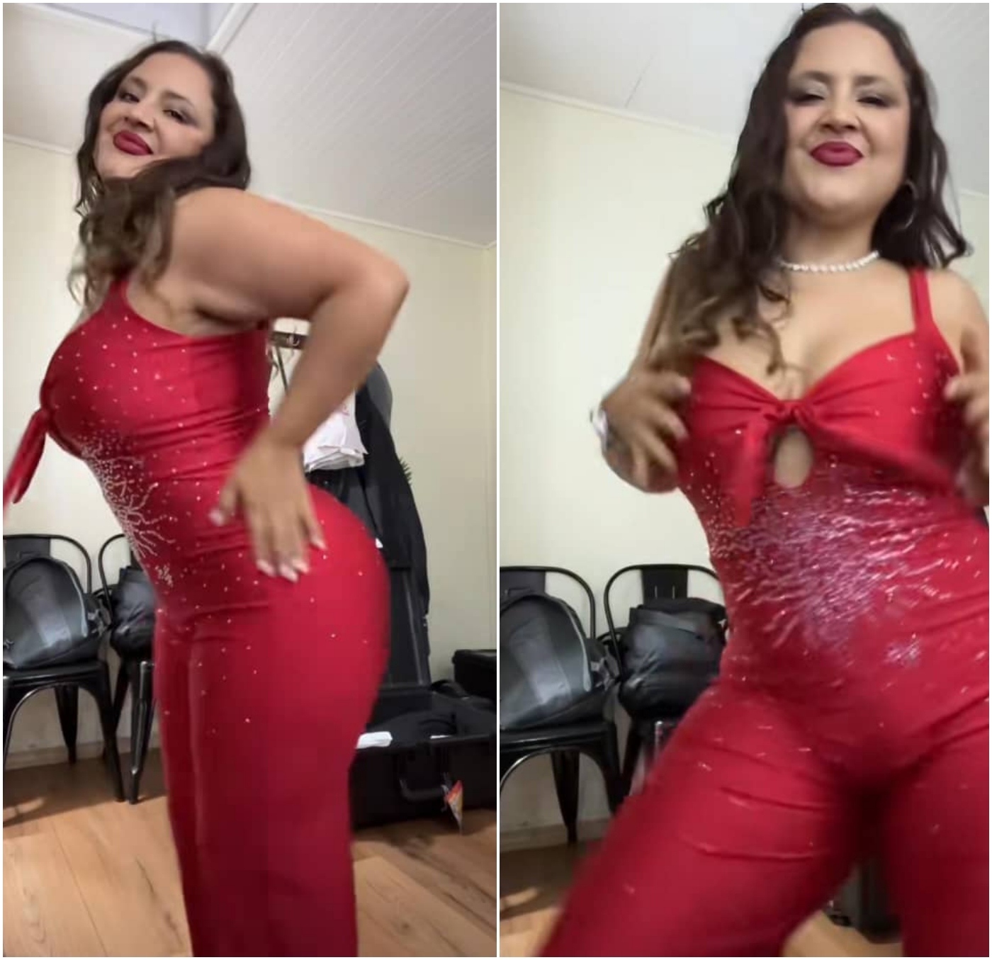“Modo garota de Puente Alto”, escribió la comediante en la descripción de su publicación. Allí luce un ajustado enterito rojo satinado con escote corazón y románticos detalles en pedrería, mientras baila al ritmo de la canción Desliza ("Ólhinho" No Corpinho) de Leo Santana.
