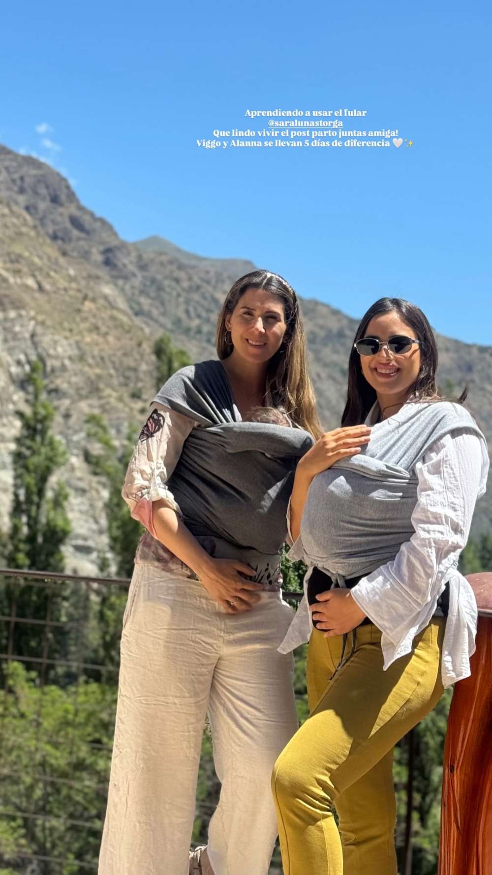 “Aprendiendo a usar el fular. Qué lindo vivir el postparto juntas, amiga. Viggo y Alanna se llevan 5 días de diferencia”, escribió Melina en la foto.