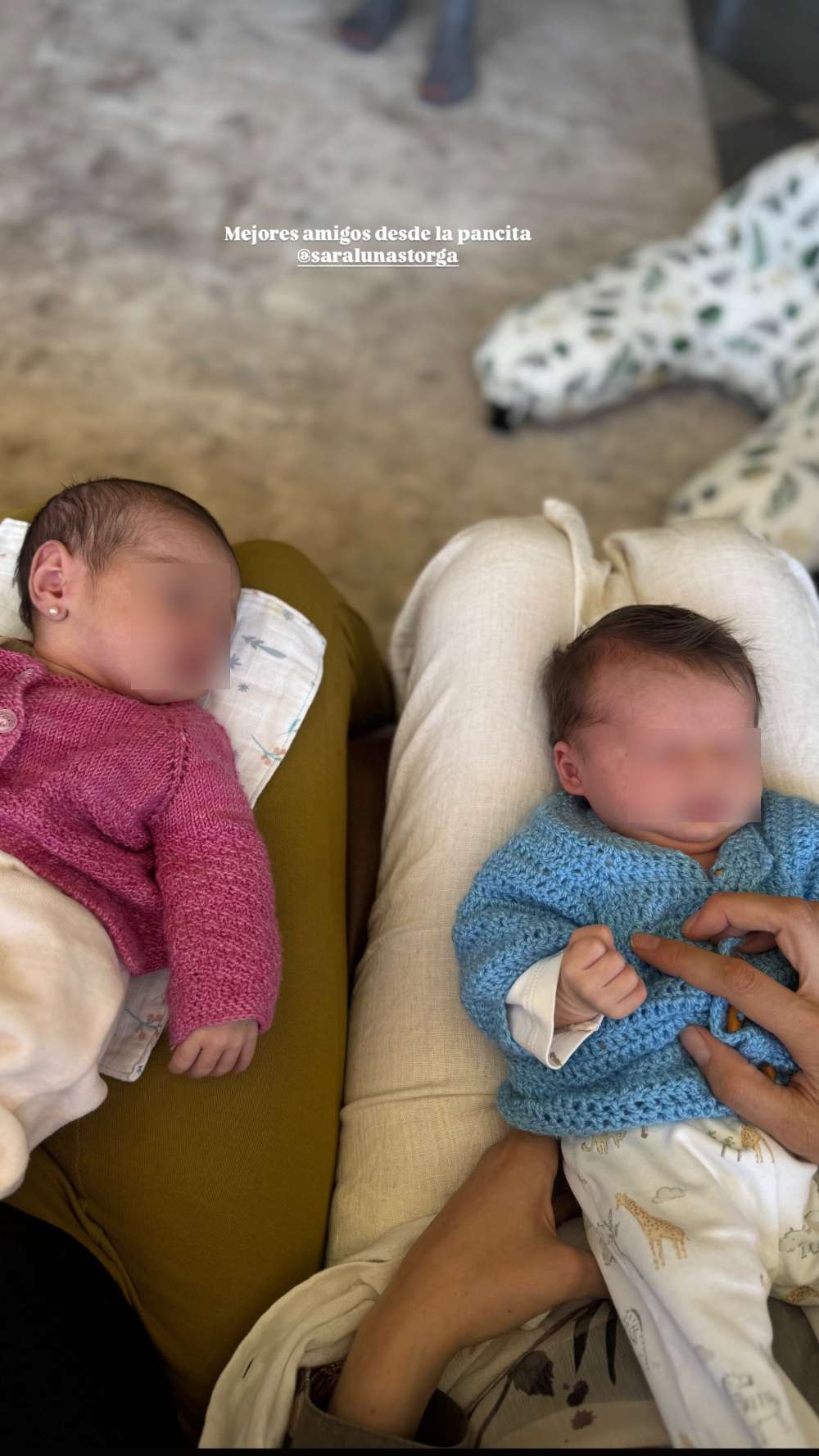 En otra postal, se ve a los dos pequeños acostados uno al lado del otro, vestidos a juego con cárdigans similares; el de la niña en rosa fucsia y el de su primito, en color celeste. “Mejores amigos desde la pancita”, expresó Noto.
