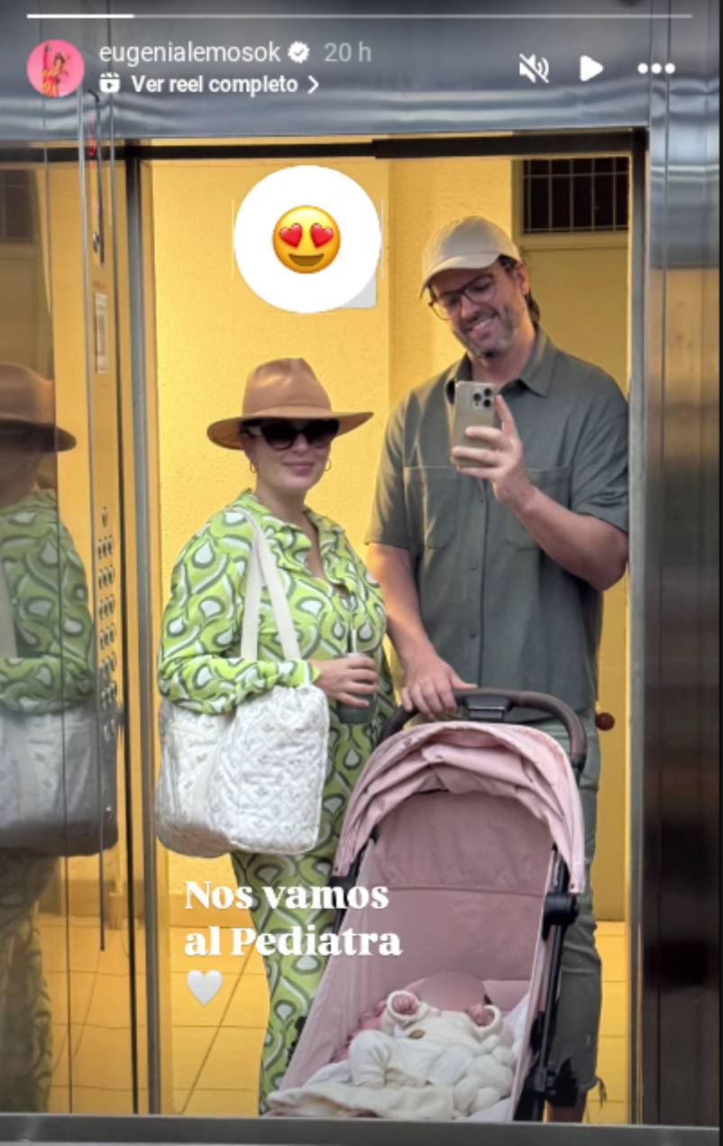 En una historia de Instagram, Eugenia compartió una tierna fotografía con su esposo y su bebé en el interior de un ascensor. La imagen la acompañó con el mensaje: “Nos vamos al pediatra”.
