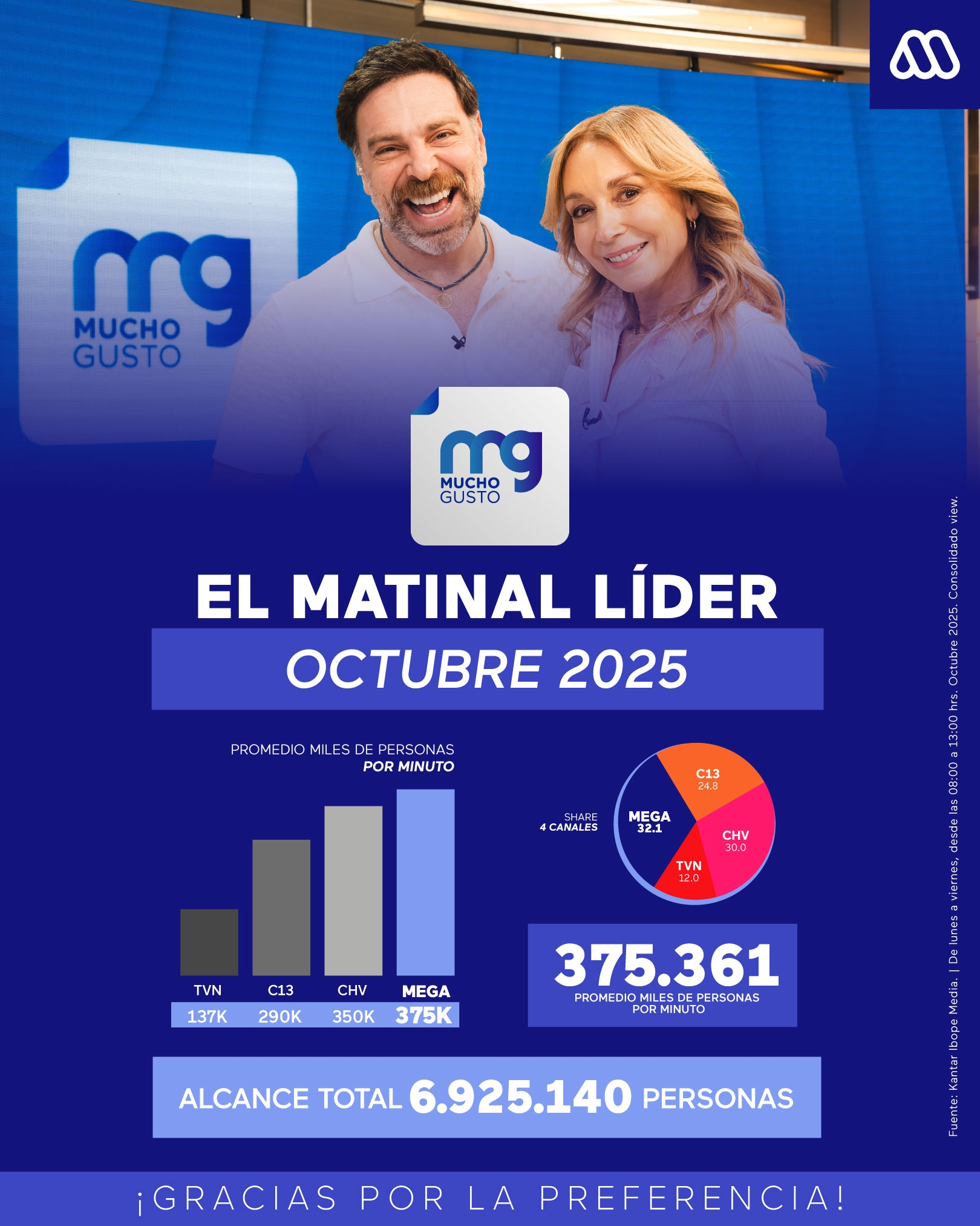 Octubre de 2025 dejó por cuarto mes consecutivo a Mucho Gusto como líder entre los programas matinales de la televisión chilena.