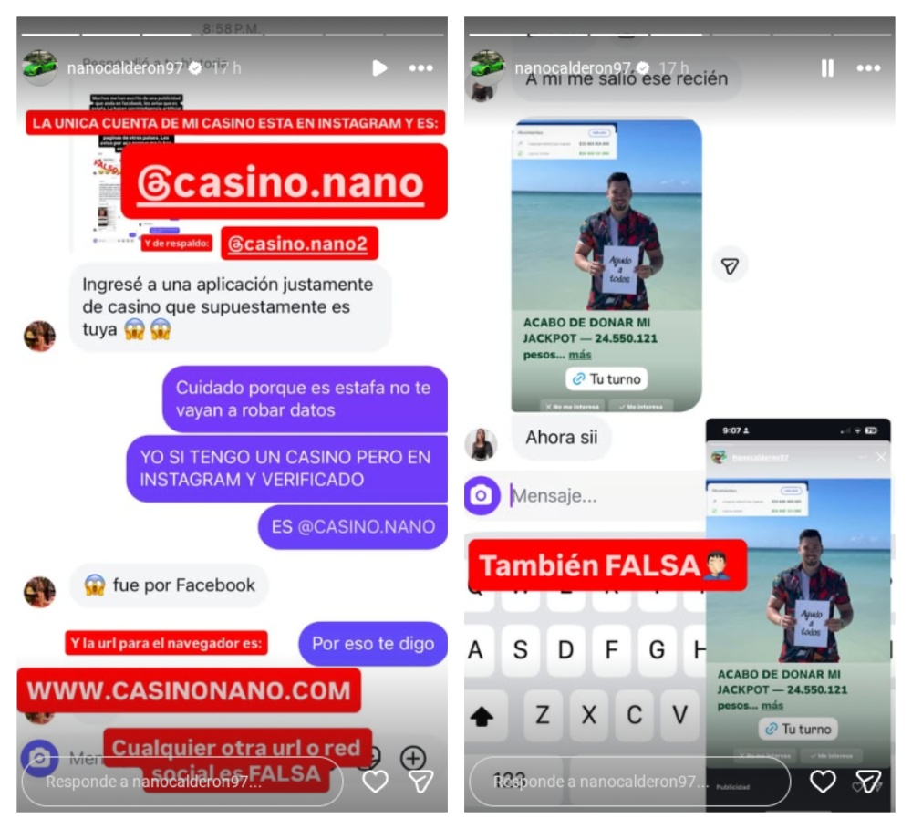Asimismo, procedió a indicar la única cuenta oficial de su casino y que “cualquier otra URL o red social, es falsa”, añadiendo capturas de supuestas campañas de recaudación que también aseguró que son un engaño.