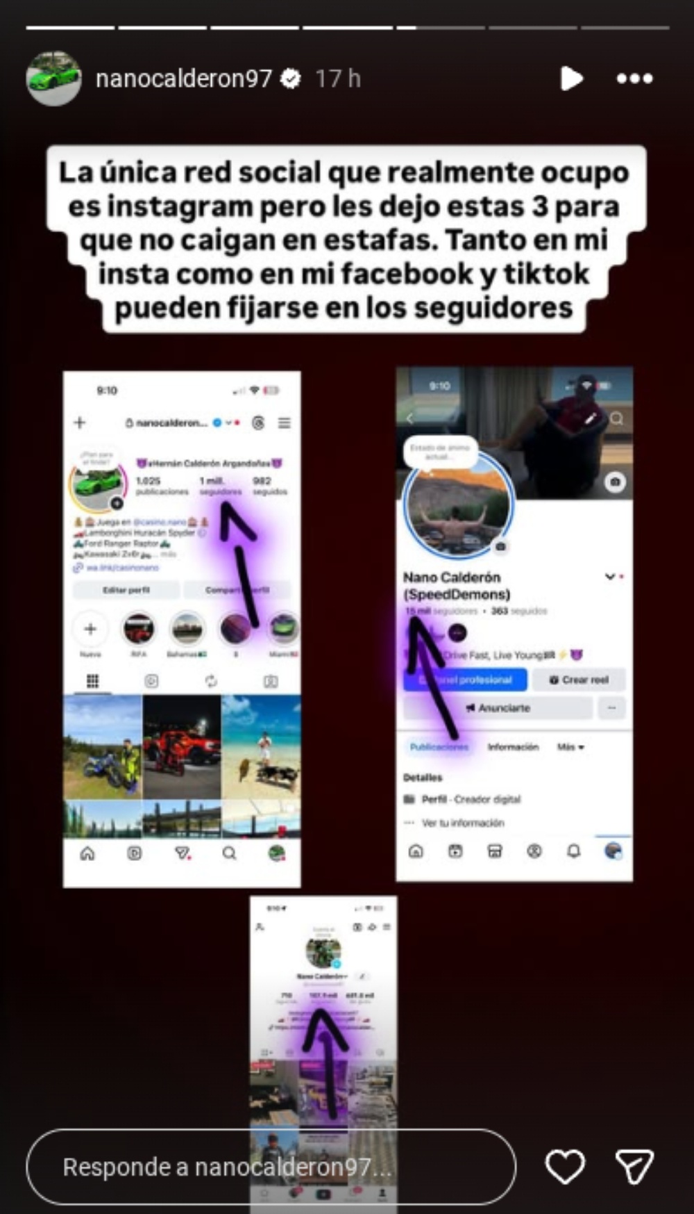 “La única red social que realmente ocupo es Instagram, pero les dejo estas 3 para que no caigan en estafas. Tanto en mi Instagram, como en mi Facebook y TikTok pueden fijarse en los seguidores”, explicó en una captura de sus perfiles oficiales.