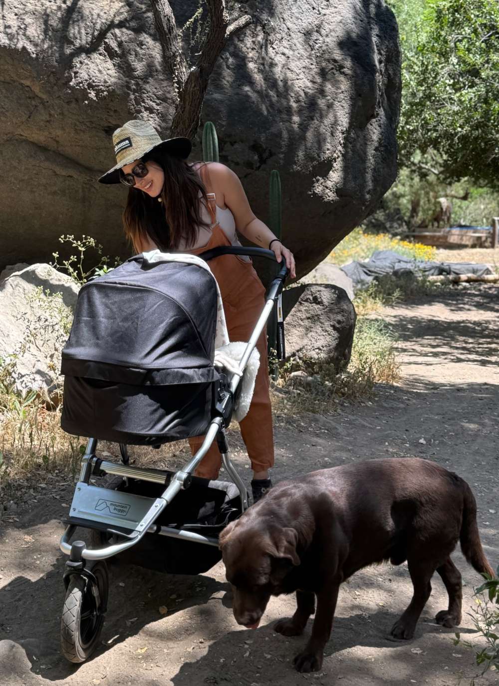 Las postales son de un paseo mañanero que realizó con una amiga, su hija en su coche y su mascota Bagual, como una familia feliz a la que solo le falta Pangal Andrade, quien está en Argentina por un campeonato de rafting.
