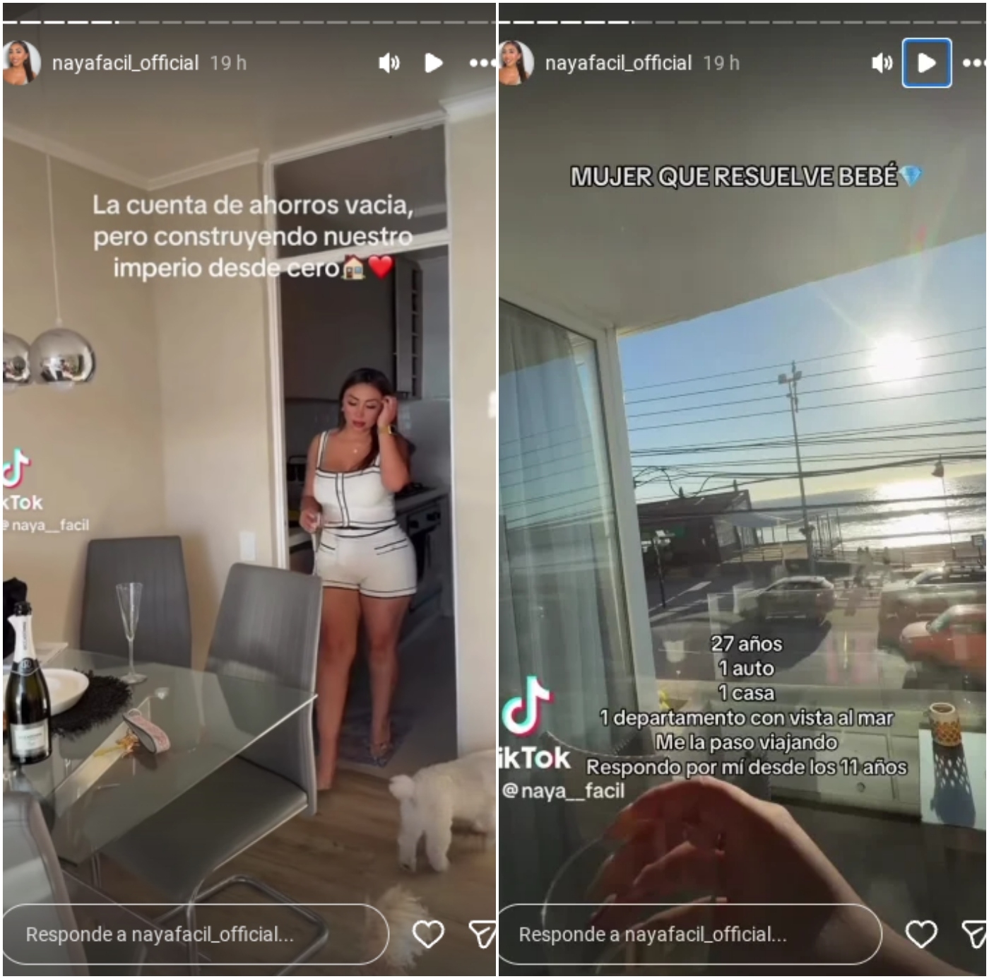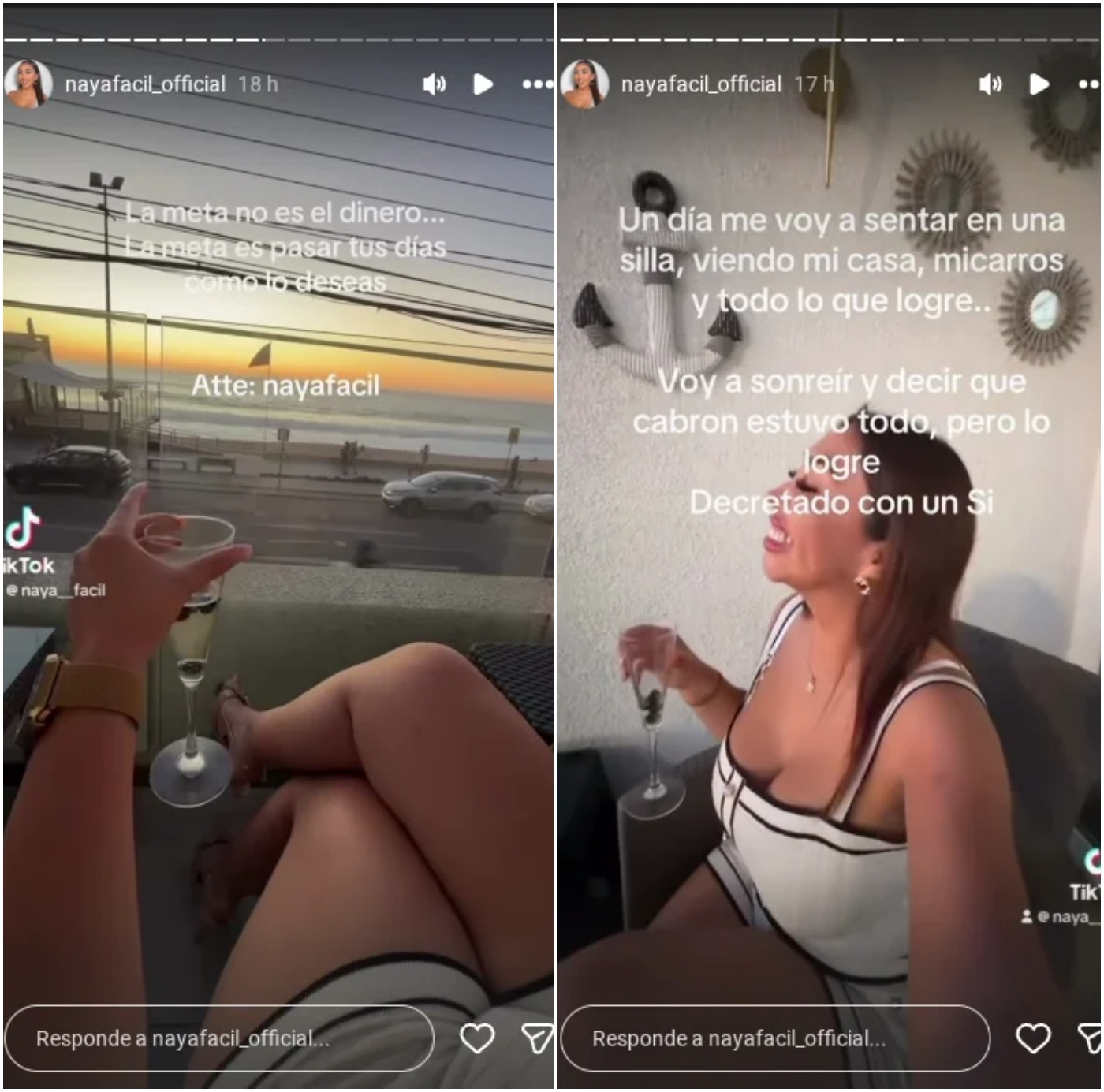 En uno de los videos que publicó, Naya aparece brindando con una copa junto con el texto: "La cuenta de ahorros vacía, pero construyendo nuestro imperio desde cero".