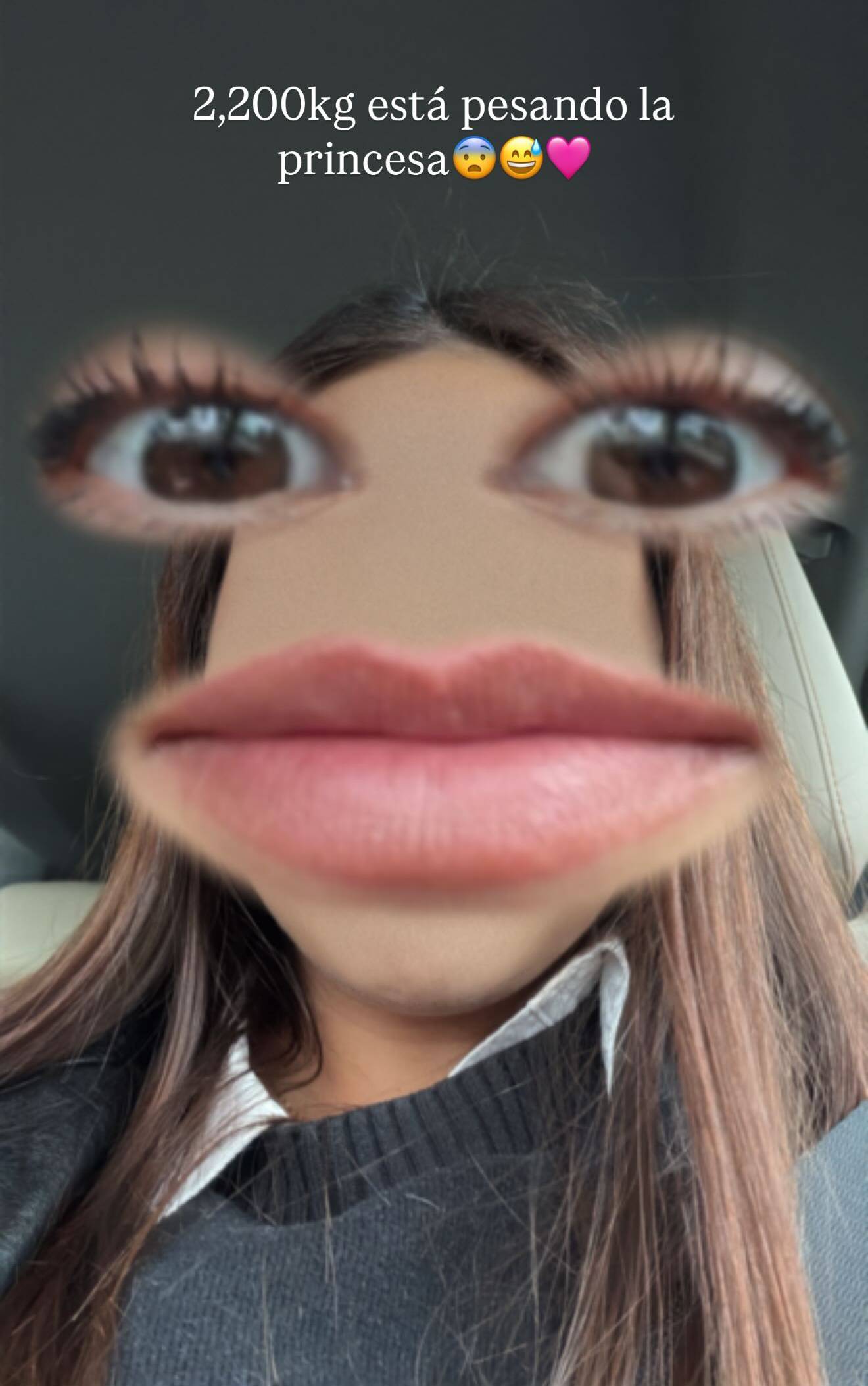Sobre su reciente evaluación médica, la influencer usó un filtro de ojos y labios grandes para revelar con humor el hecho de que su pequeña ya pesa unos sorprendentes 2,200 kilogramos.