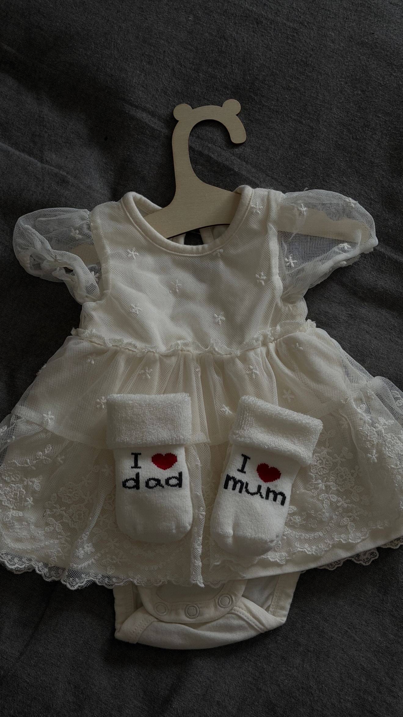 Para complementar este conjunto, ideal para los primeros días de vida de su hija, la tiktoker también compró un par de medias, ambas bordadas con las frases "I love mom" y "I love dad".