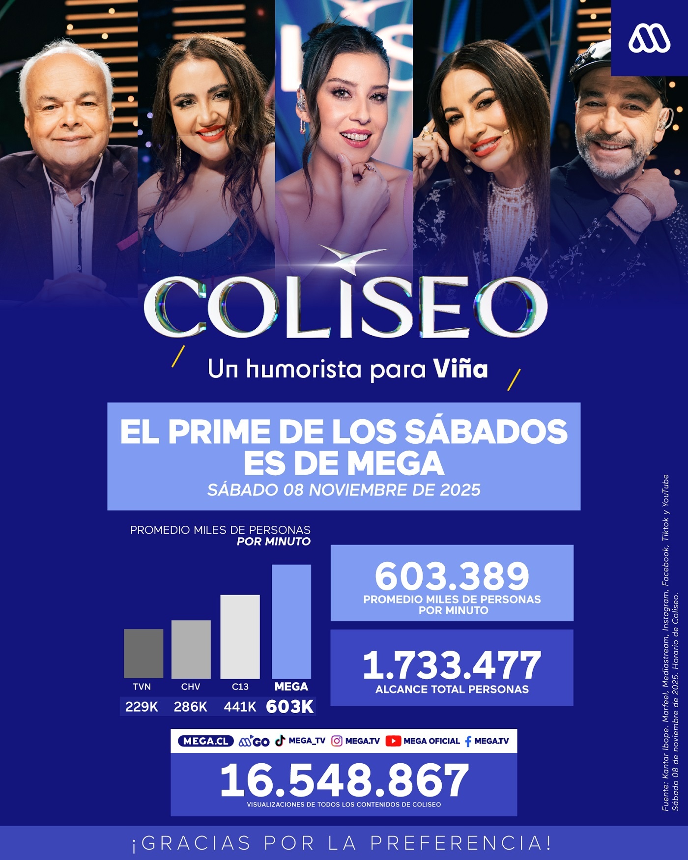 El pasado sábado 8 de noviembre, la televisión chilena estuvo marcada por la amplia preferencia del público por el contenido de humor. Coliseo lideró en audiencias con un margen de más de 150 mil personas promedio por minuto versus su más cercano competidor.