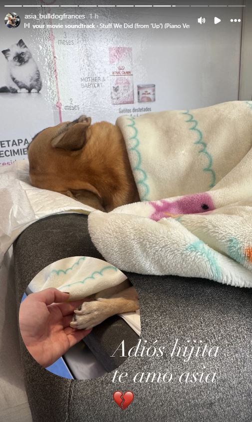 Sin embargo, lamentablemente, la perrita no pudo recuperarse tras la intervención médica y murió en esta jornada. "Adiós, hijita. Te amo, Asia", escribió Barrientos en una imagen donde aparece su mano sosteniendo la patita de su amada mascota.